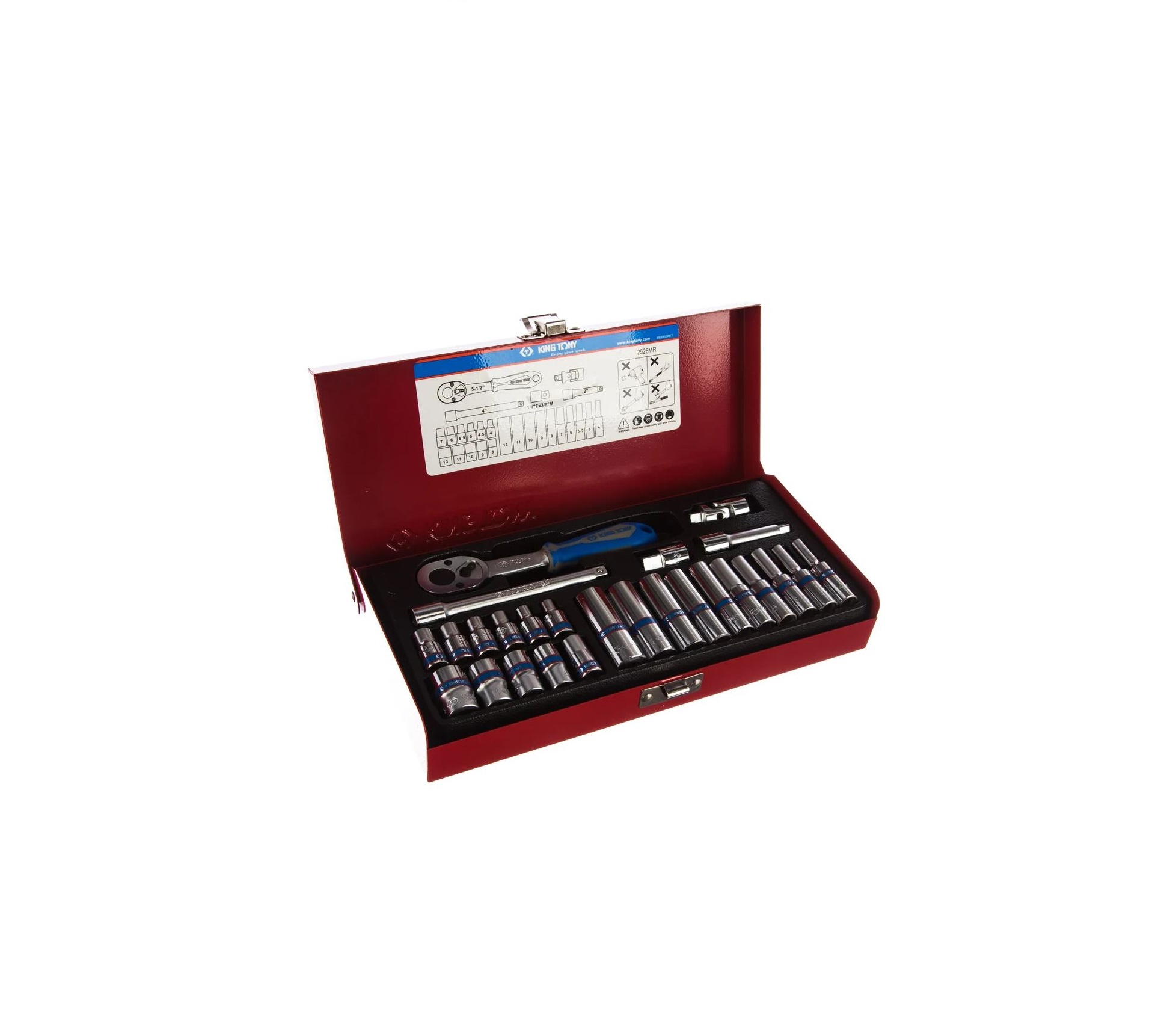 Набор с инструментом торговой марки king tony включает в себя торцевые головки и принадлежности, предназначен для монтажа и демонтажа крепёжных узлов различных изделий, устройств и агрегатов.