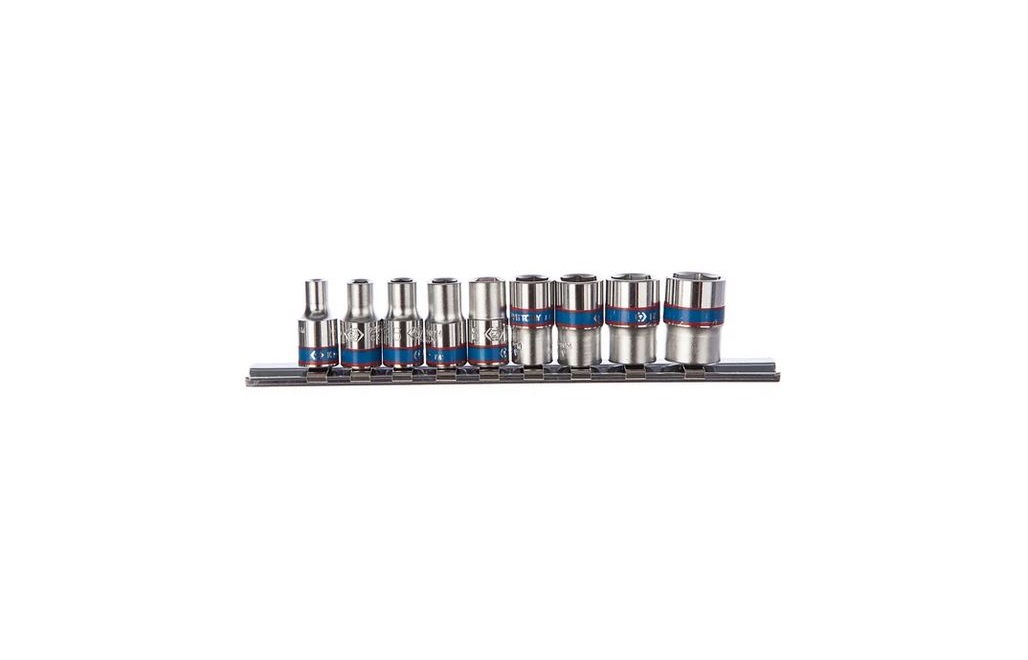 Набор слесарного ручного инструмента профессионального качества King Tony 2509MR составлен из 9-ти торцевых головок с рабочими размерами от 4 до 13 миллиметров и присоединительным квадратом 1/4 дюйма. Головки размещаются на металлическом держателе.
