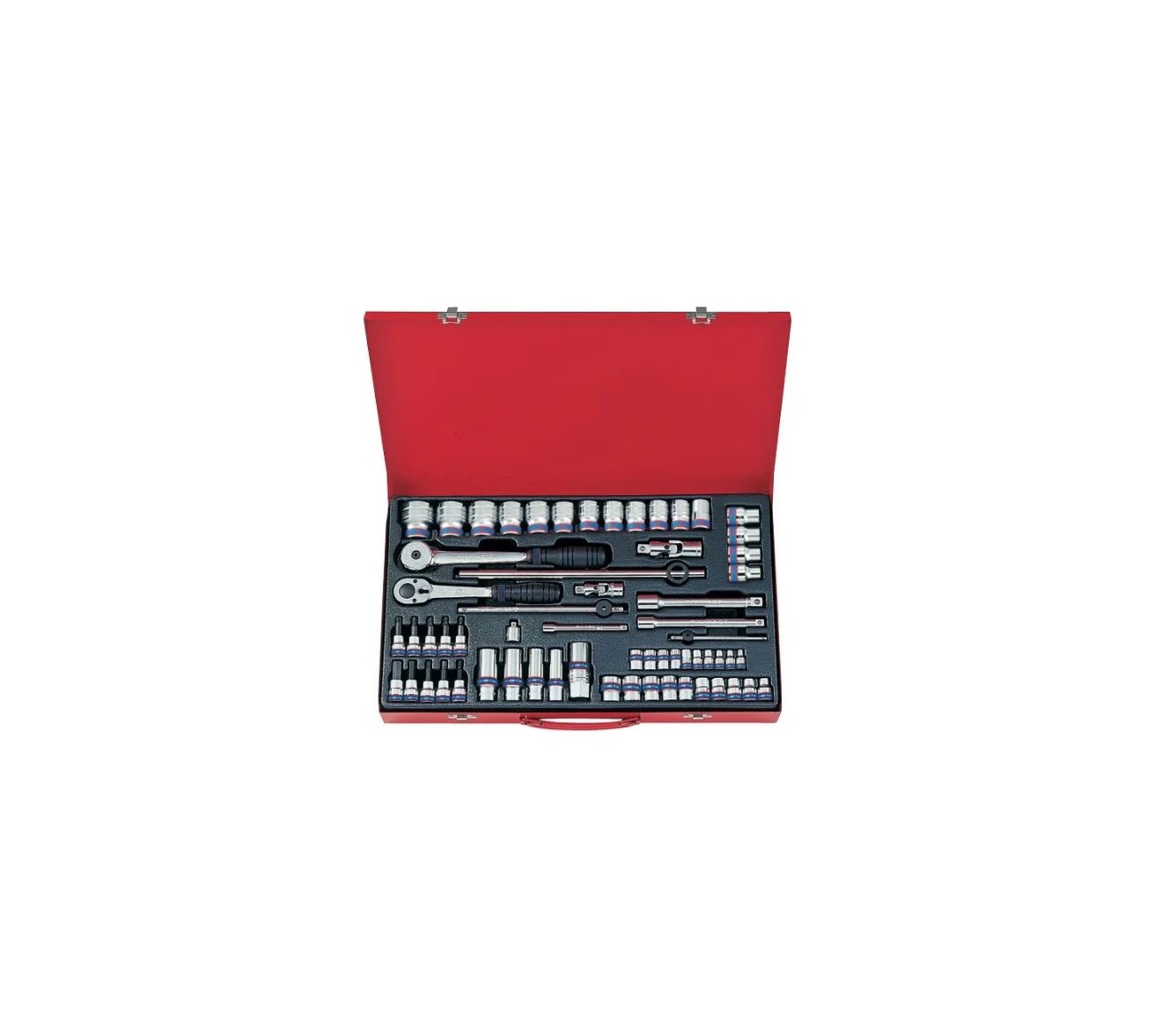 Набор представляет собой комплект долговечных ручных инструментов и оснастки высокого качества. Элементы набора активно используются в сфере профессионального обслуживания автомобилей. Кейс из металла препятствует случайной потере головок и насадок при транспортировке.