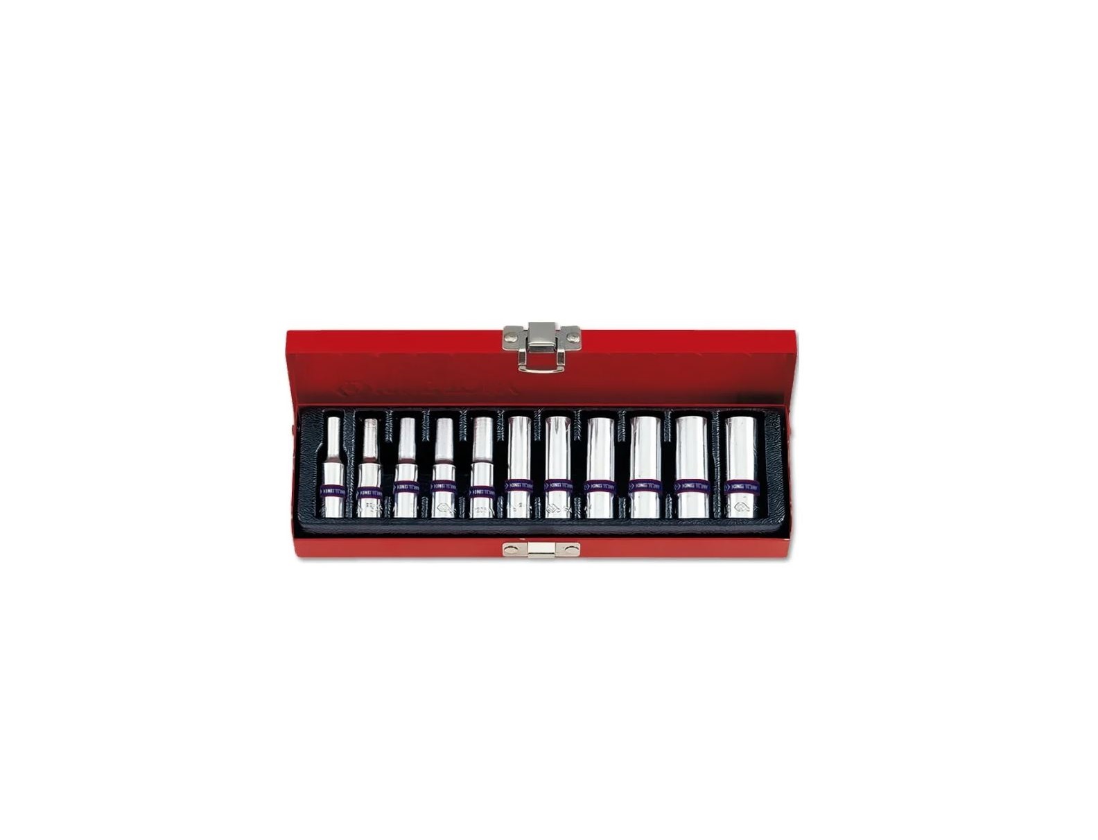 Набор слесарного ручного инструмента профессионального качества King Tony 2511MR составлен из 11-ти глубоких торцевых головок с рабочими размерами от 4 до 13 мм и присоединительным квадратом 1/4 дюйма. Головки размещаются в металлическом кейсе с габаритами 223x65x32 мм.