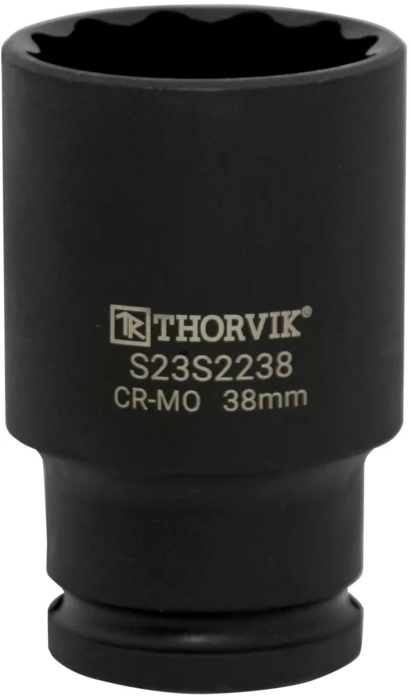 Головка торцевая ударная глубокая 12-гранная 1/2"DR, 34 мм Thorvik изготовлена с применением технологий, позволяющих передавать усилия, превышающие расчетные по современным стандартам на 30%. Широкий диапазон размеров, типов и профилей, высокая точность обработки, качественная хромомолибденовая сталь (Cr-Mo) и устойчивое фосфатированное покрытие делают инструмент надежным и долговечным. Торцевые головки Thorvik являются основной для создания систем сборного слесарно-монтажного инструмента. Имеет отверстие для фиксирующего штифта и выточка для уплотнительного кольца.