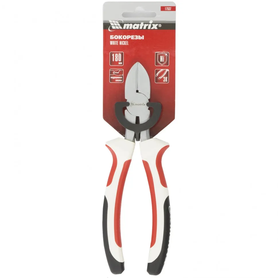Никелированные бокорезы Matrix White Nickel 17537 длиной 180 мм, с трехкомпонентными рукоятками, предназначены для проведения слесарно-монтажных работ. Инструмент позволяет быстро и без особых усилий перерезать пластиковые и металлические детали, проволоку, а также перекусывать кабели и провода.ПреимуществаАнтикоррозийные свойства — никелированное покрытие обеспечивает защиту от разрушения и долгий срок службы инструмента.Надежный хват — эргономичные трехкомпонентные рукоятки удобно лежат в руке и снижают усталость при длительной работе.Безопасная эксплуатация — ограничители на ручках не дают руке соскользнуть к режущим частям.