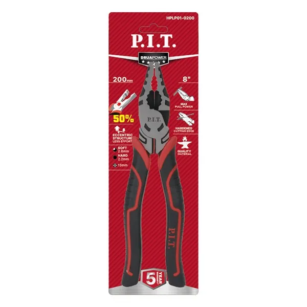 Плоскогубцы HPLP01-0200 входят в линейку высококачественных инструментов серии DRUA POWER и представляют собой усиленный шарнирно-губцевый инструмент. Конструкция шарнирного механизма с эксцентриком обеспечивает увеличенную до 50% передачу усилия на рабочую часть инструмента. Благодаря этому перекусывание кабеля или металлического прутка большого диаметра не требует приложения больших усилий. Двухкомпонентный материал рукояток обеспечивает комфортное применение