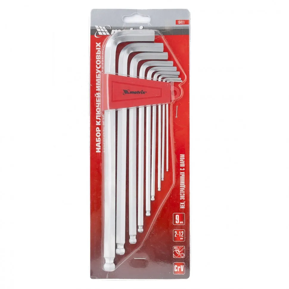 Набор экстра-длинных имбусовых ключей Matrix 16411 с шаром и сатинированным покрытием, 9 шт., CrV, предназначен для монтажа и демонтажа болтов с профилем HEX 2-12 мм. Шлиц с внутренним шестигранником чаще всего встречается при сборке мебели и ремонте велосипедов. С экстра-длинными ключами Г-образной формы легче работать, в том числе и в труднодоступных местах. А наконечники в виде шариков позволяют производить монтаж/демонтаж метизов под углом.ПреимуществаКлючи из стали CrV твердостью 50-55 HRC обладают высоким ресурсом за счет прочности конструкции.Ключи обработаны методом сатинирования для получения гладкой поверхности без микронеровностей, это гарантирует крепкий захват в руке.Практичный держатель с подвесом обеспечивает удобство хранения ключей.Набор включает 9 ключей для работы с крепежом разного типоразмера.