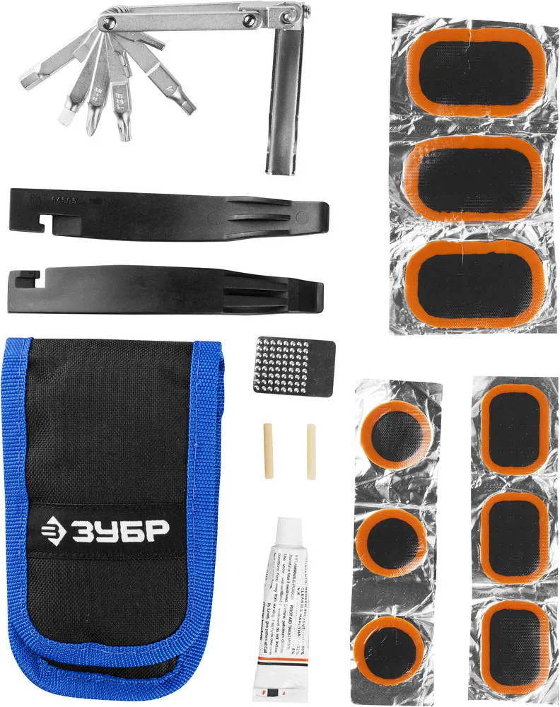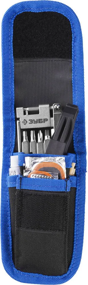 Набор для обслуживания велосипеда включает в себя мультиинструмент, состоящий из отверток и ключей, а так же комплект для ремонта камер.