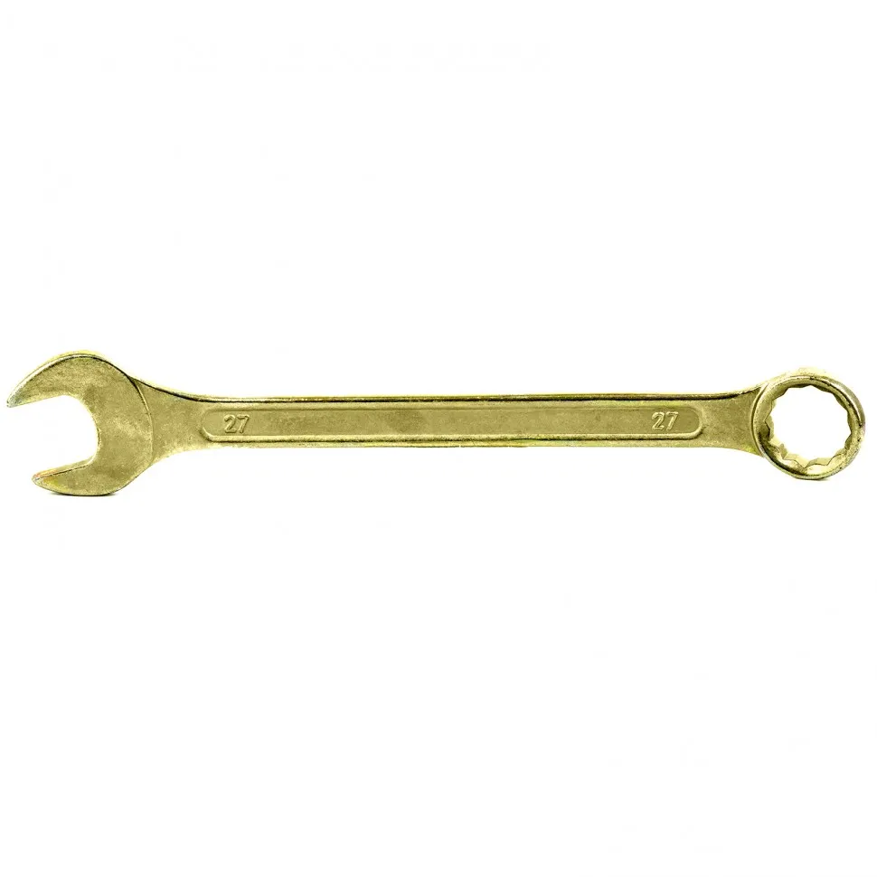 Комбинированный ключ Сибртех 14987, 27 мм, покрытый желтым цинком, предназначен для слесарно-монтажных работ с резьбовыми соединениями. Наличие рожкового и кольцевого зева делает ключ универсальным в применении. Накидная головка с 12-гранным профилем надежно удерживает крепеж, уменьшая риск его деформации. Ключ будет полезен при проведении строительных и ремонтных работ, пригодится для сборки и разборки оборудования, а также необходим в быту.ПреимуществаИнструмент изготовлен из прочной углеродистой стали 45, рабочая часть закалена до твердости 42 HRC, что соответствует требованиям ГОСТ.Накидная головка расположена под углом 15 градусов к плоскости ключа, что позволяет работать в труднодоступных местах.Желтое цинковое покрытие защищает от повреждений и коррозии.