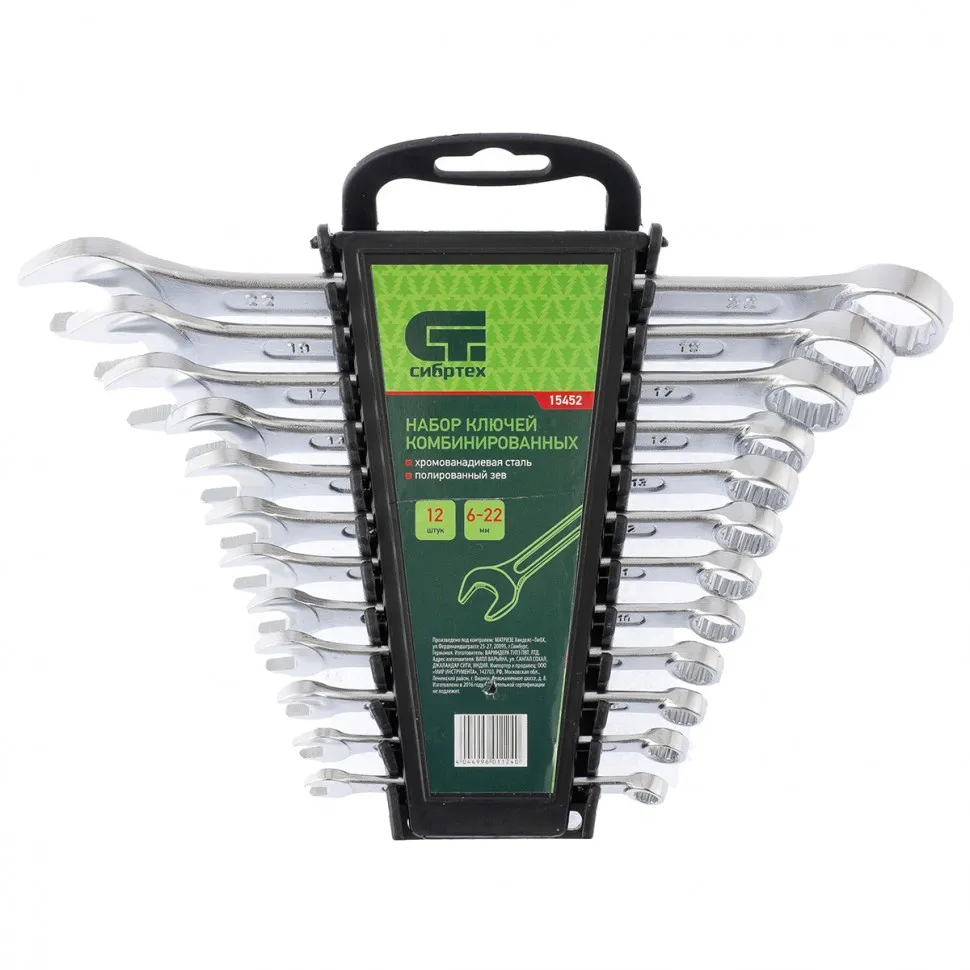 Набор комбинированных ключей Сибртех 15452 включает в себя 12 инструментов из стали CrV для работы с резьбовыми крепежами диаметром от 6 до 22 мм. Каждый ключ снабжен рожковым и 12-гранным кольцевым зевом, который максимально плотно соприкасается с поверхностью гайки или болта — это уменьшает риск ее деформации. Набор незаменим при ремонте автомобиля, а также будет полезен для сборки техники или решения бытовых задач.ПреимуществаКлючи характеризуются повышенной прочностью, т.к. изготовлены из стали хромованадиевой группы, а рабочие части закалены до твердости 45 HRC (полное соответствие требованиям ГОСТ).Хромированное покрытие увеличивает срок службы инструментов, поскольку защищает их от коррозии и механических повреждений.Накидные головки наклонены под углом 15 градусов к плоскости ключей, что повышает комфорт при работе.Набор поставляется в удобном пластиковом держателе, из которого легко извлекать нужный инструмент.