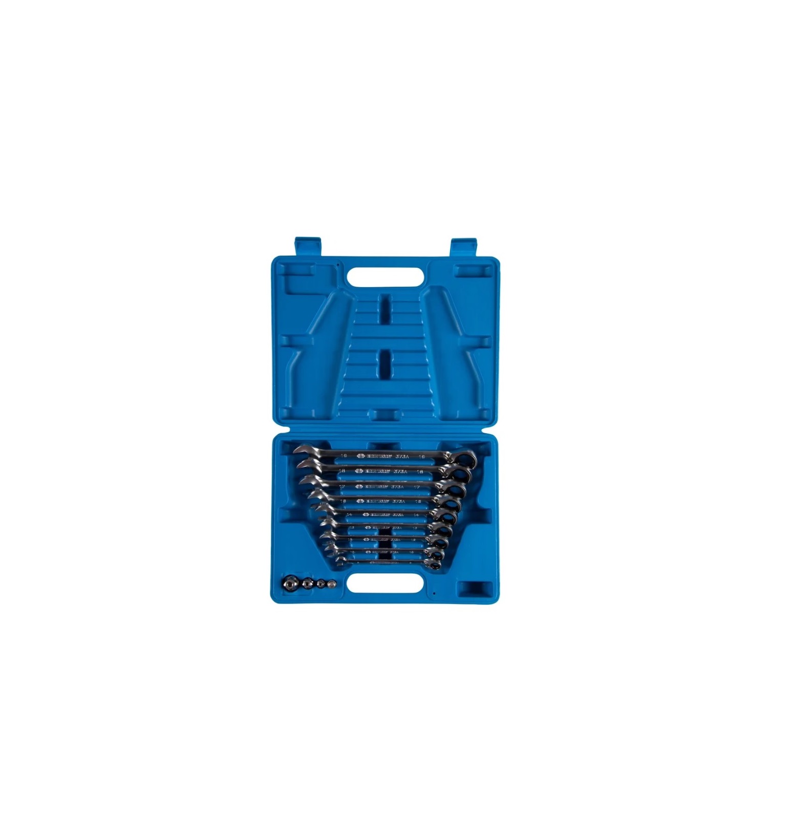 Комплектация – Ключи трещоточные комбинированные 8, 10, 12, 13, 14, 16, 17, 18, 19 мм (373A) – Адаптер для торцевых головок 1/4" под ключ 10 мм (373202R) – Адаптер для торцевых головок 3/8" под ключ 13 мм (373203R) – Адаптер для торцевых головок 1/2" под ключ 19 мм (373204R) – Держатель вставок (бит) 1/4" под ключ 10 мм (373202H) – Кейс из пластика PE-HD