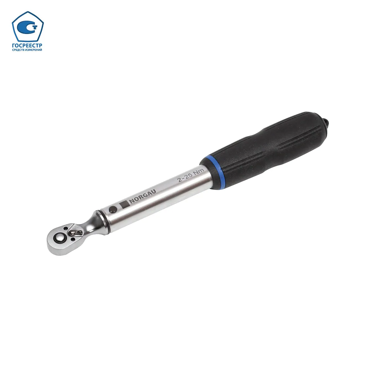 Ключ динамометрический 1/4” предельный бесшкальный со встроенной трещоткой, диапазон усилия 2-25 Нм, тип NTW21-025PR. На торце ключа располагается защитная крышка, которая предотвращает попадание грязи в механизм настройки ключа. Настройка момента затяжки осуществляется с помощью специального ключа и измерителя крутящего момента (ИКМ), которые приобретаются дополнительно. Прочная трубчатая конструкция со специально разработанным механизмом настройки крутящего момента предотвращает его преднамеренное изменение или случайный сброс настроек. Серийный номер расположен в зоне, защищенной от повреждения при работе с инструментом. Длина рычага 147 мм, длина ключа 200 мм, вес 0,26 кг. Внесен в Государственный реестр средств измерений. Поставляется в пластиковом тубусе.
