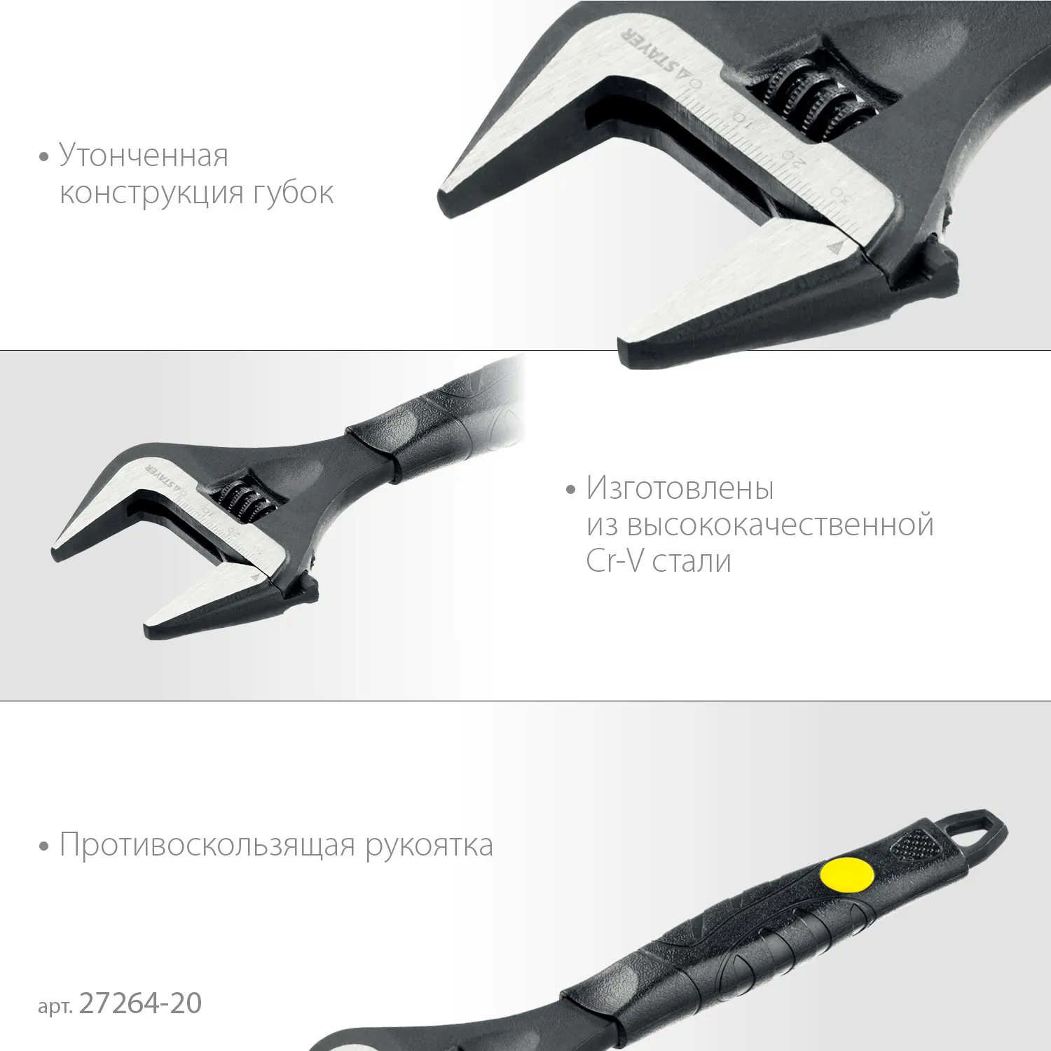 Профессиональные разводные ключи STAYER предназначены для завинчивания гаек, болтов и других деталей, изготовлены из высококачественной хромованадиевой стали, снабжены миллиметровой измерительной шкалой, а, благодаря наличию тонких губок, инструмент удобен для выполнения работ в труднодоступных местах.