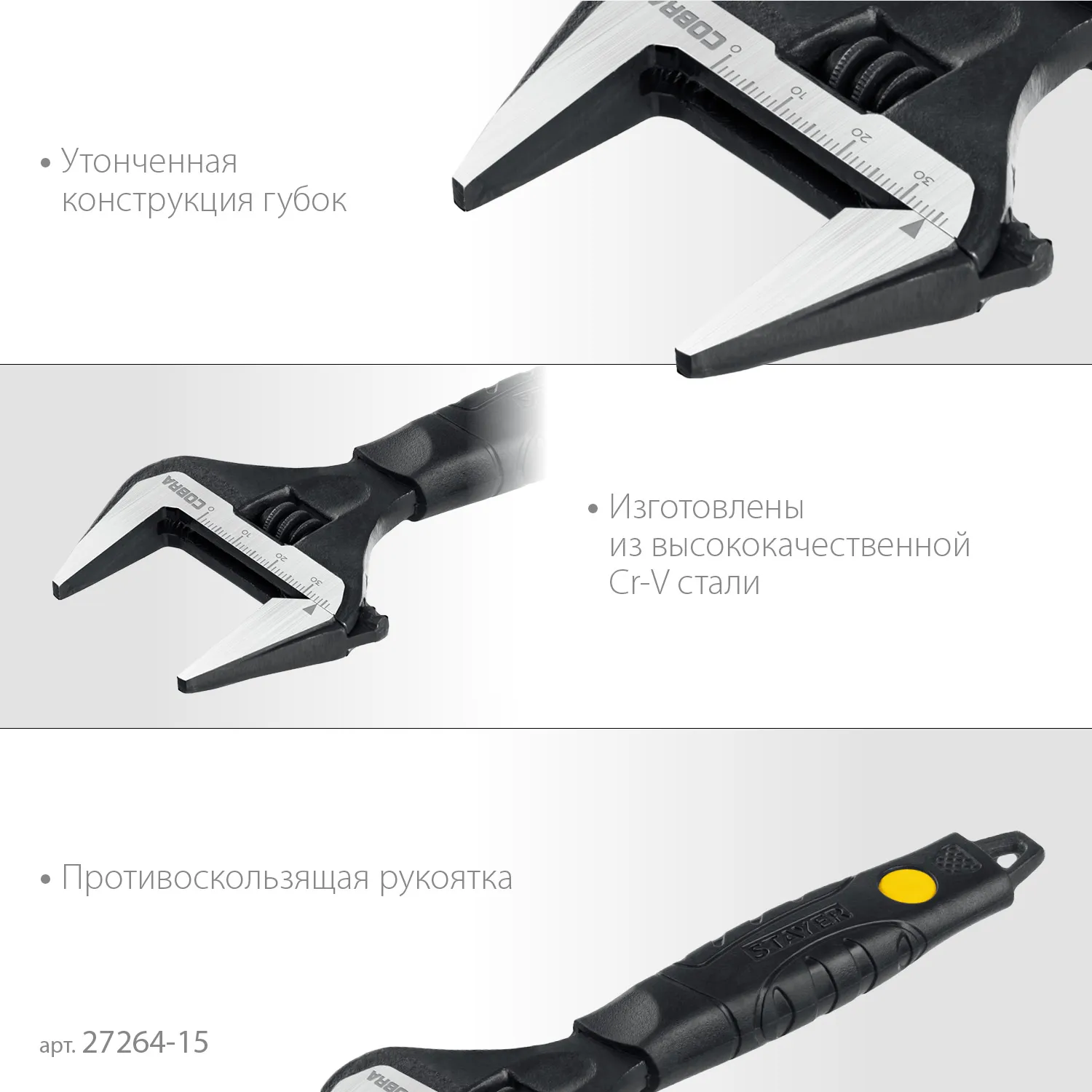 Профессиональные разводные ключи STAYER предназначены для завинчивания гаек, болтов и других деталей, изготовлены из высококачественной хромованадиевой стали, снабжен миллиметровой измерительной шкалой и фосфатированным покрытием, а благодаря наличию тонких губок, инструмент удобен для выполнения работ в труднодоступных местах.