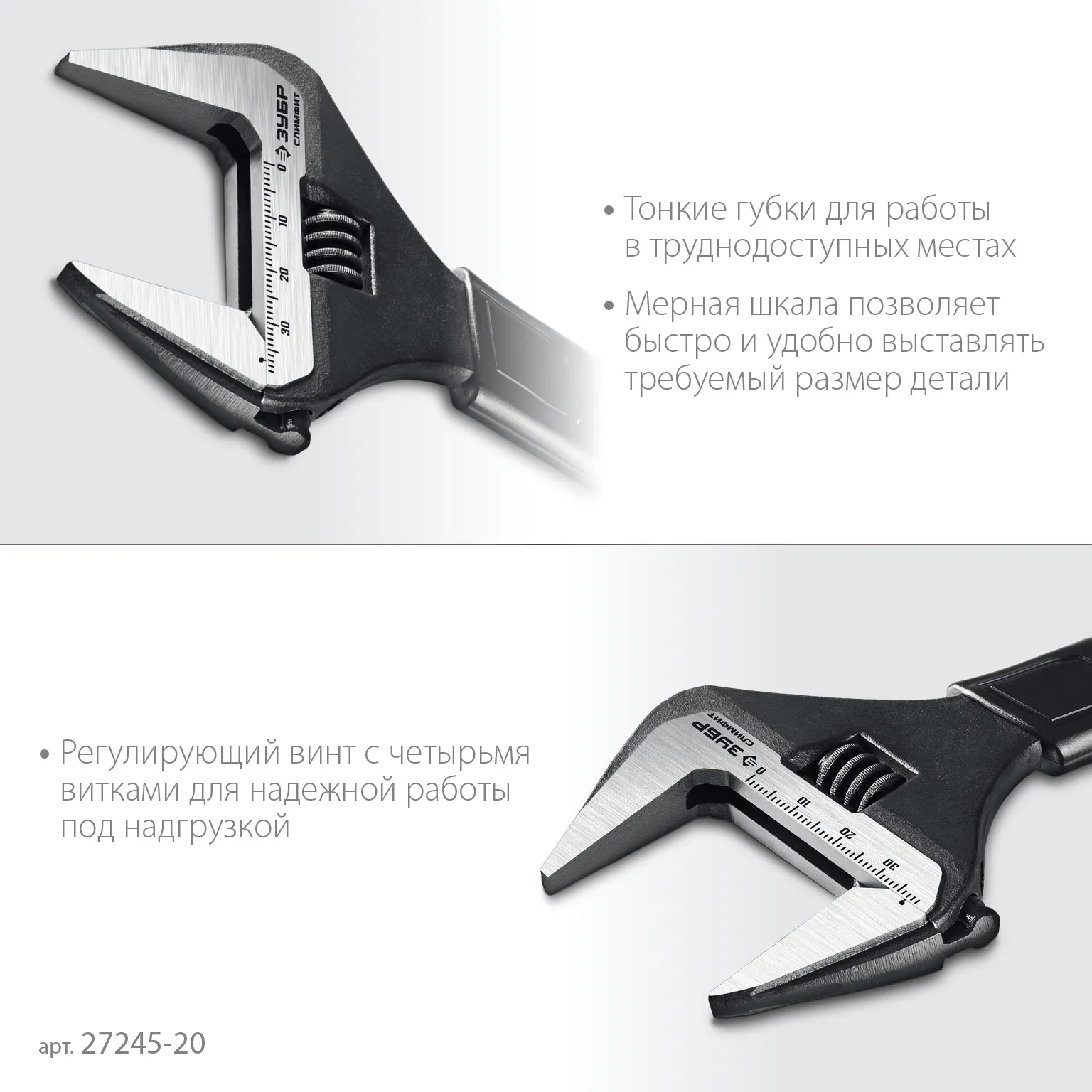 Ключи разводные ЗУБР ″СлимФит″ изготовлены из высокопрочной легированной стали CR-V, защищены от коррозии благодаря фосфатированному покрытию. Обладают повышенным ресурсом и обеспечивают длительную и качественную работу по монтажу и демонтажу резьбовых соединений.