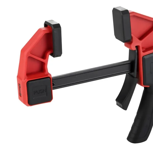 Быстрозажимная струбцина HCLQ01-0450 представляет собой удобное приспособление для фиксации заготовок. Опорная губка перемещается и фиксируется по всей длине направляющей при помощи рукоятки, а также может переставляться на другой конец направляющей, что позволяет использовать струбцину «на разжим».