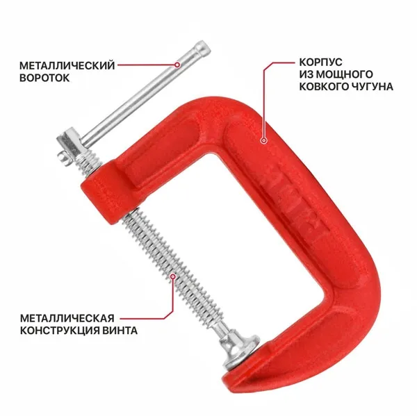 Струбцина винтовая G-образная ручная HCLG01-0075 предназначена для зажима и фиксации заготовок из металла, дерева и других материалов в определённом положении, необходимом для их обработки или склеивания.