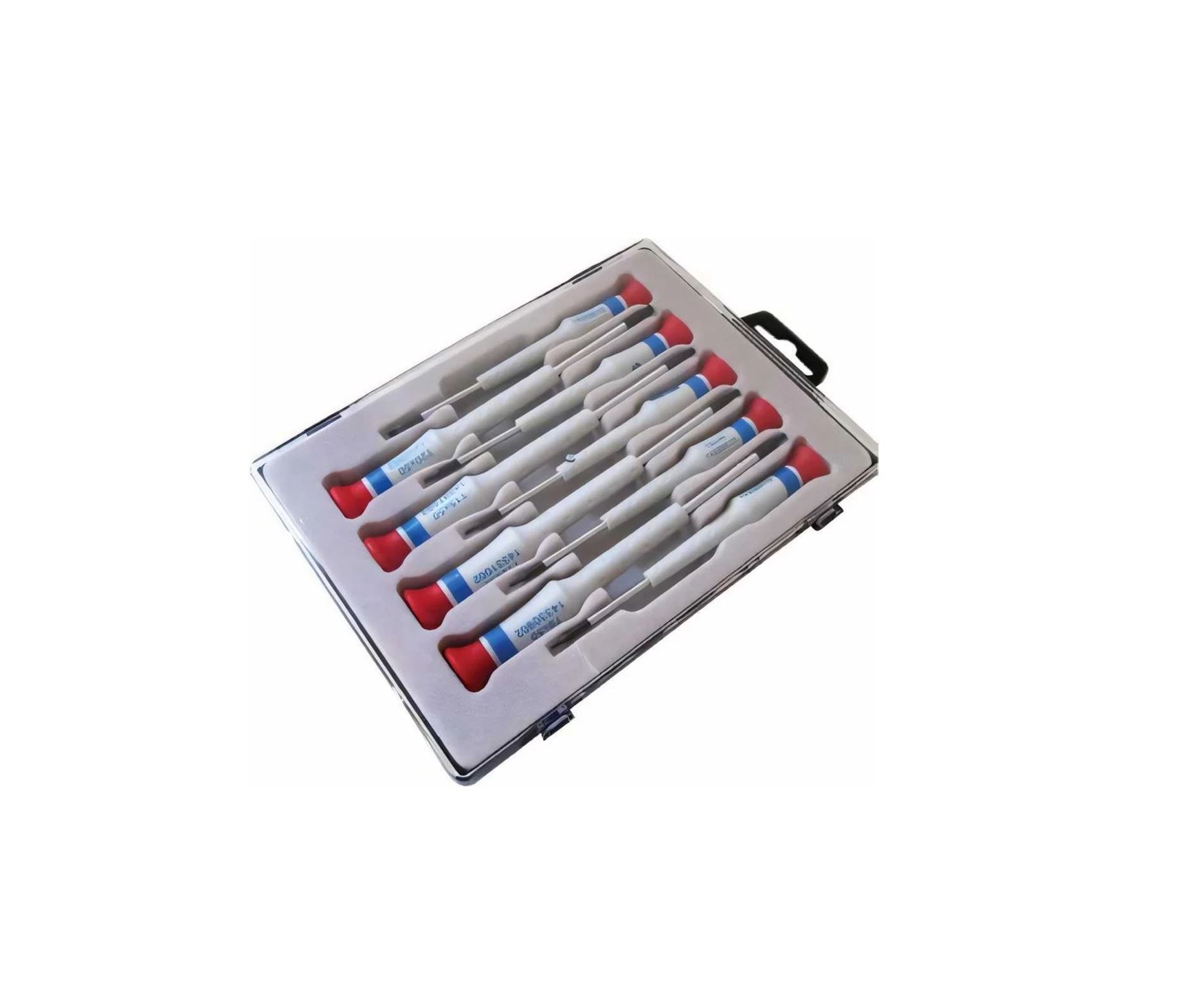 Набор включает прецизионные отвертки длиной 135–140 мм с наконечниками TORX различных размеров. Все инструменты расположены в кейсе, каждый в своей ячейке для удобства и быстрого поиска. Кейс изготовлен из пластика PP, обладающего высокой прочностью и стойкостью к маслам и растворителям, что обеспечивает удобное хранение и защиту от потери инструментов.