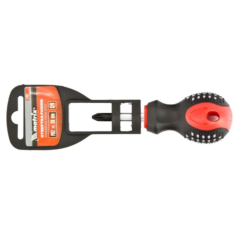 Отвертка Matrix Fusion 11431, PH2 х 38 мм, из стали CrV, с 3-х компонентной рукояткой «anti slip», предназначена для работ с резьбовым крепежом, имеющим крестообразный шлиц Phillips. Профессиональная отвертка пригодится при выполнении строительных, монтажных и ремонтных работ, а также при сборке мебели и ремонте автомобиля. Небольшая длина стержня 38 мм позволяет проводить работы в труднодоступных местах и ограниченном пространстве.ПреимуществаСтержень и жало выполнены из износостойкой легированной стали CrV твердостью 50-52 HRC, что обеспечивает долгий срок службы отвертки.Намагниченный наконечник позволяет зафиксировать крепеж и направлять отвертку одной рукой, а другой придерживать закрепляемую деталь.Фосфатированный шлиц обеспечивает улучшенное сцепление с крепежом для удобства работы.Трехкомпонентная рукоятка «anti slip» с подпальцевыми выемками и специальными секциями обеспечивает комфортный и надежный хват без проскальзывания.