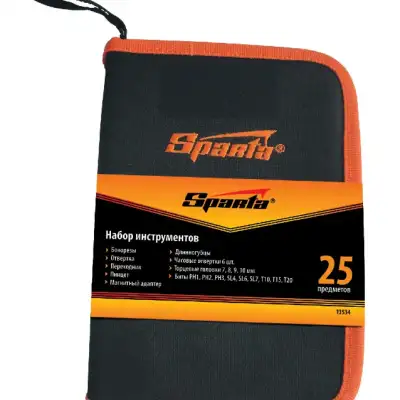 Набор Sparta 13534 включает 25 предметов, необходимых при проведении слесарно-монтажных работ. Он рассчитан на бытовое использование, поэтому будет полезен в хозяйстве. С помощью часовых отверток можно провести точные работы, биты и торцевые головки позволяют осуществить монтаж/демонтаж резьбовых соединений, вспомогательный инструмент пригодится для захвата и удержания деталей, удлинитель используется для работы в труднодоступных местах.ПреимуществаКомплектующие набора выполнены из инструментальной стали и закалены, что придает им необходимую прочность и твердость.Отвертка, бокорезы и длинногубцы имеют пластиковые рукоятки для удобства захвата.Компактный тканевый пенал на молнии обеспечивает удобство и безопасность транспортировки/хранения набора.
