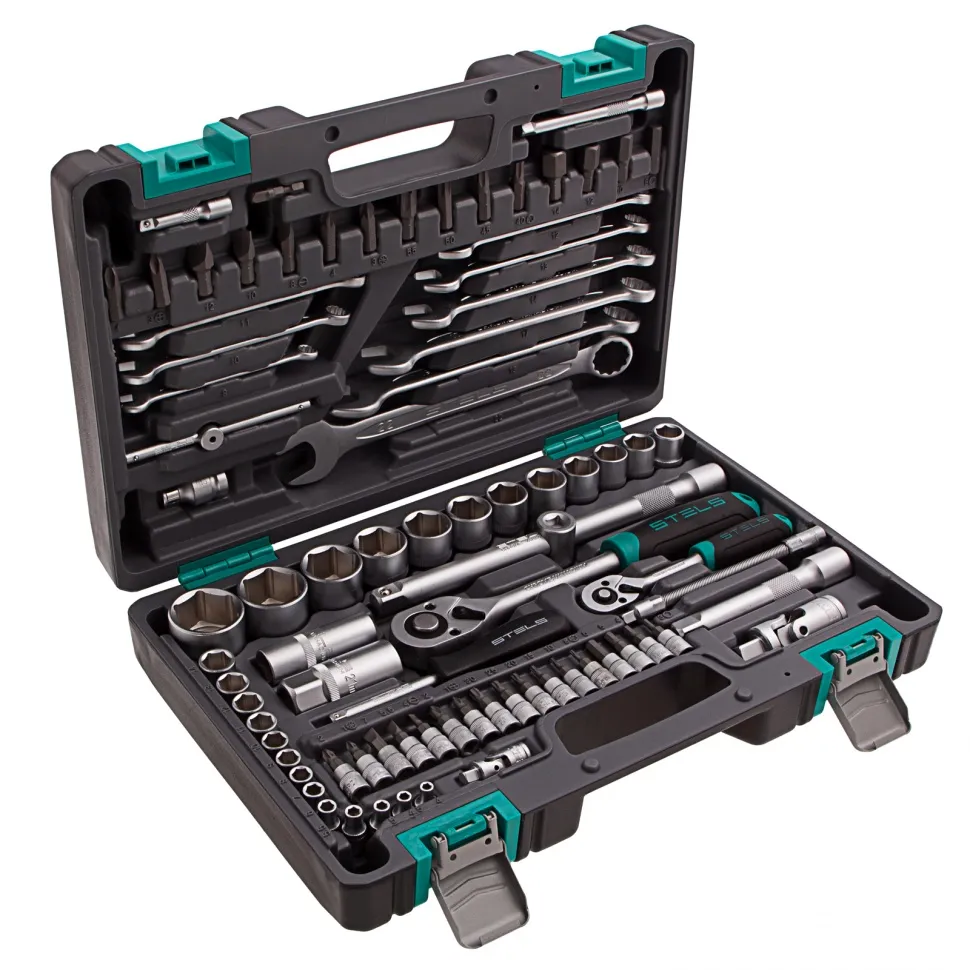Комплектация | Ключ трещоточный - 2 шт, Головки 4, 4.5, 5, 5.5, 6, 7, 8, 9, 10, 11, 12, 13, 14, 15, 16, 17, 18, 19, 20, 22, 24, 27, 30, 32 - 25 шт, Удлинитель гибкий - 1 шт, Ключи комбинированные 8, 10, 11, 12, 13, 14, 17, 19, 22 - 9 шт, Кардан - 2 шт, Удлинитель - 3 шт, Адаптер для бит - 1 шт, Головки свечные - 2 шт, Вороток Т-образный - 2 шт, Биты с торцевой головкой Н, T, SL, PH - 17 шт, Адаптер - 2 шт, Биты-вставки T, SL, PH, PZ, H - 15 шт, Отвертка держатель для бит - 1 шт, Кейс - 1 шт |