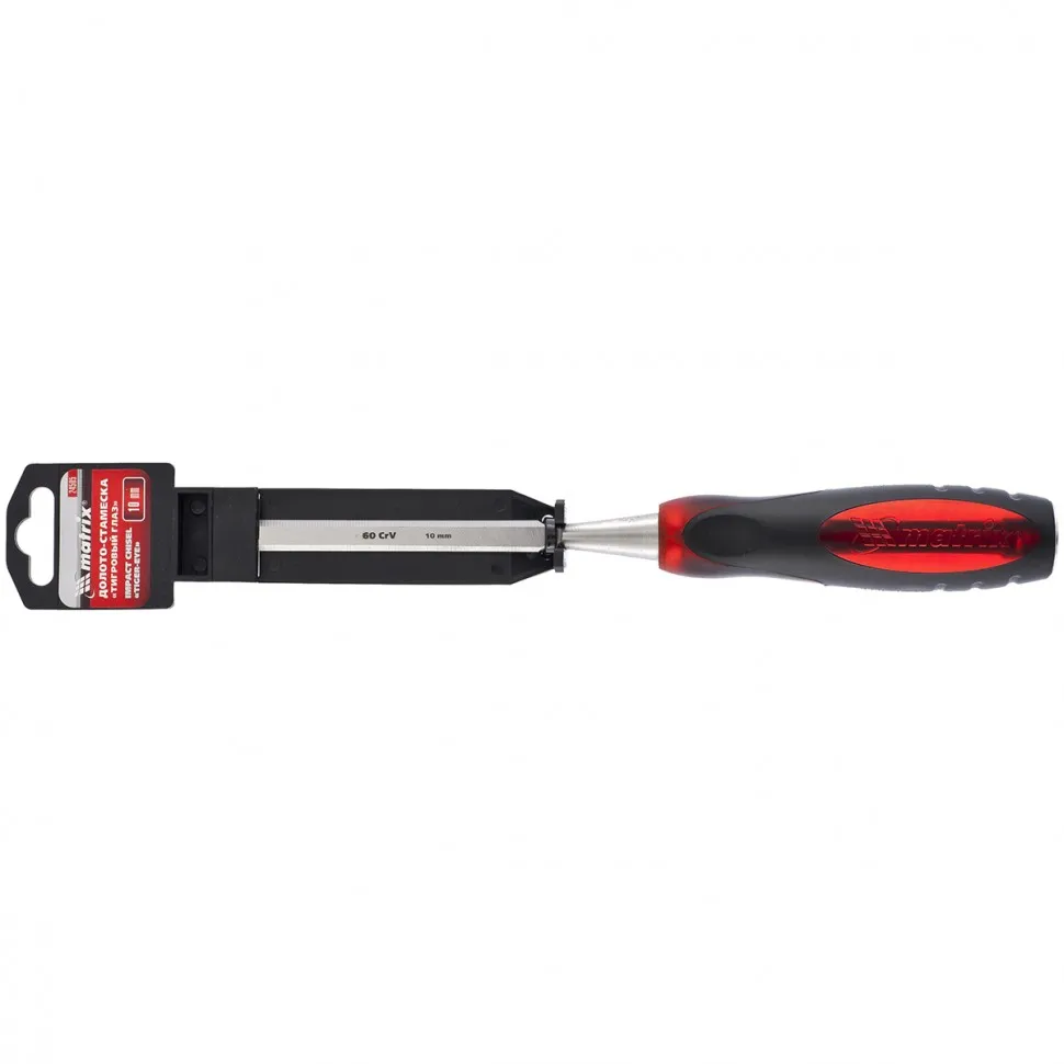 Долото-стамеска Matrix «Тигровый глаз» 24505, 10 мм, с двухкомпонентной обрезиненной рукояткой, используется в столярном и плотницком деле, в производстве мебели. С его помощью можно вырезать углубления, формировать пазы, зачищать шипы и гнезда, снимать фаски. Долото-стамеска выдерживает удары киянкой или молотком, т.к. металлический затыльник защищает его от деформации.ПреимуществаПолотно выполнено из легированной стали хромованадиевой группы, поэтому отличается повышенной прочностью, стойкостью к износу и позволяет добиться необходимой твердости инструмента.Долото-стамеска обладает твердостью 65 HRC (0,7 длины рабочей части полотна), поэтому длительное время сохраняет режущие свойства.Острое как бритва лезвие обработано на заводе под углом 20-35°, повторная заточка потребуется минимум через 6 месяцев.Конструкцией предусмотрен металлический стержень, проходящий сквозь рукоятку, что повышает прочность и долговечность инструмента.Двухкомпонентная рукоятка с резиновыми вставками и упорами под пальцы не скользит в руке и снижает усталость при работе.Долото относится к профессиональному ручному инструменту, но может применяться и в домашних условиях.