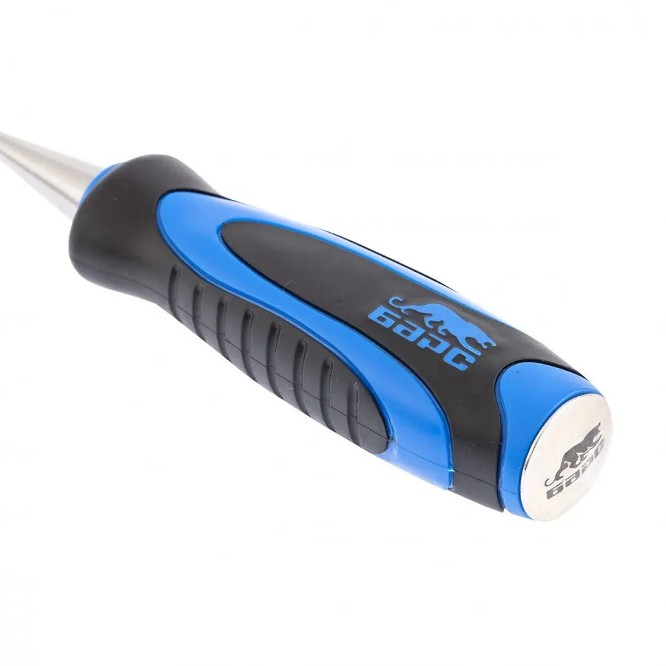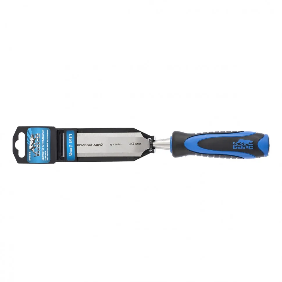 Плоское долото-стамеска Барс 24655 с шириной режущей части 30 мм, с двухкомпонентной рукояткой и металлическим затыльником, предназначено для выборки прямоугольных пазов, снятия фасок, обработки шиповых соединений и выполнения других столярно-плотницких работ. Используется для работы с массивом дерева любой твердости. По затыльнику рукоятки можно наносить удары киянкой или небольшим молотком, поэтому инструмент легко погружается в древесину и обеспечивает аккуратный ровный контур среза.ПреимуществаПрочность — полотно из легированной хромованадиевой стали 40ХФА выдерживает динамические нагрузки.Высокий ресурс — полотно на 2/3 длины рабочей части закалено до твердости 57-62 HRC и заточено под углом 20-35 градусов, повторная заточка требуется не чаще 1-2 раз в год.Крепкая рукоятка — металлический затыльник предотвращает деформацию стамески от удара молотком или киянкой.Комфортная работа — двухкомпонентная обрезиненная рукоятка с рельефными элементами не выскальзывает из ладони.
