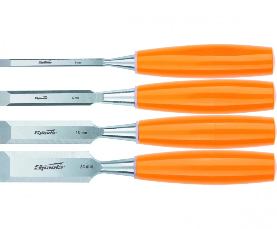Набор Sparta 24411 из 4 плоских стамесок с полотнами шириной 6, 12, 18 и 24 мм предназначен для ручной обработки дерева — зачистки кромок и гнезд, снятия фасок, нанесения декоративной резьбы. Угол заточки составляет 20-35° — режущие кромки снимают тонкую стружку, что обеспечивает точность и аккуратность работ. Набор используется в столярном и плотницком деле, пригодится и в домашней мастерской.