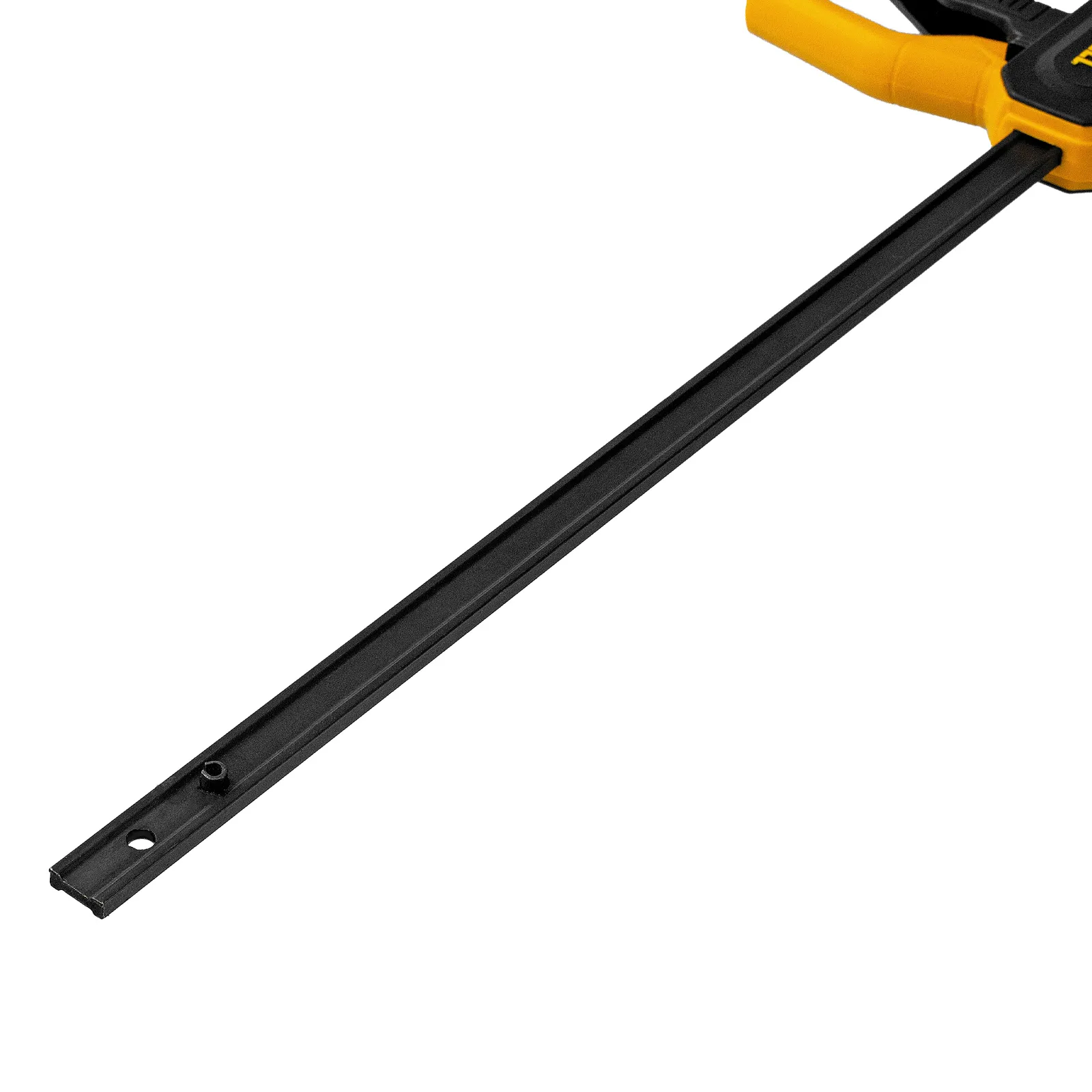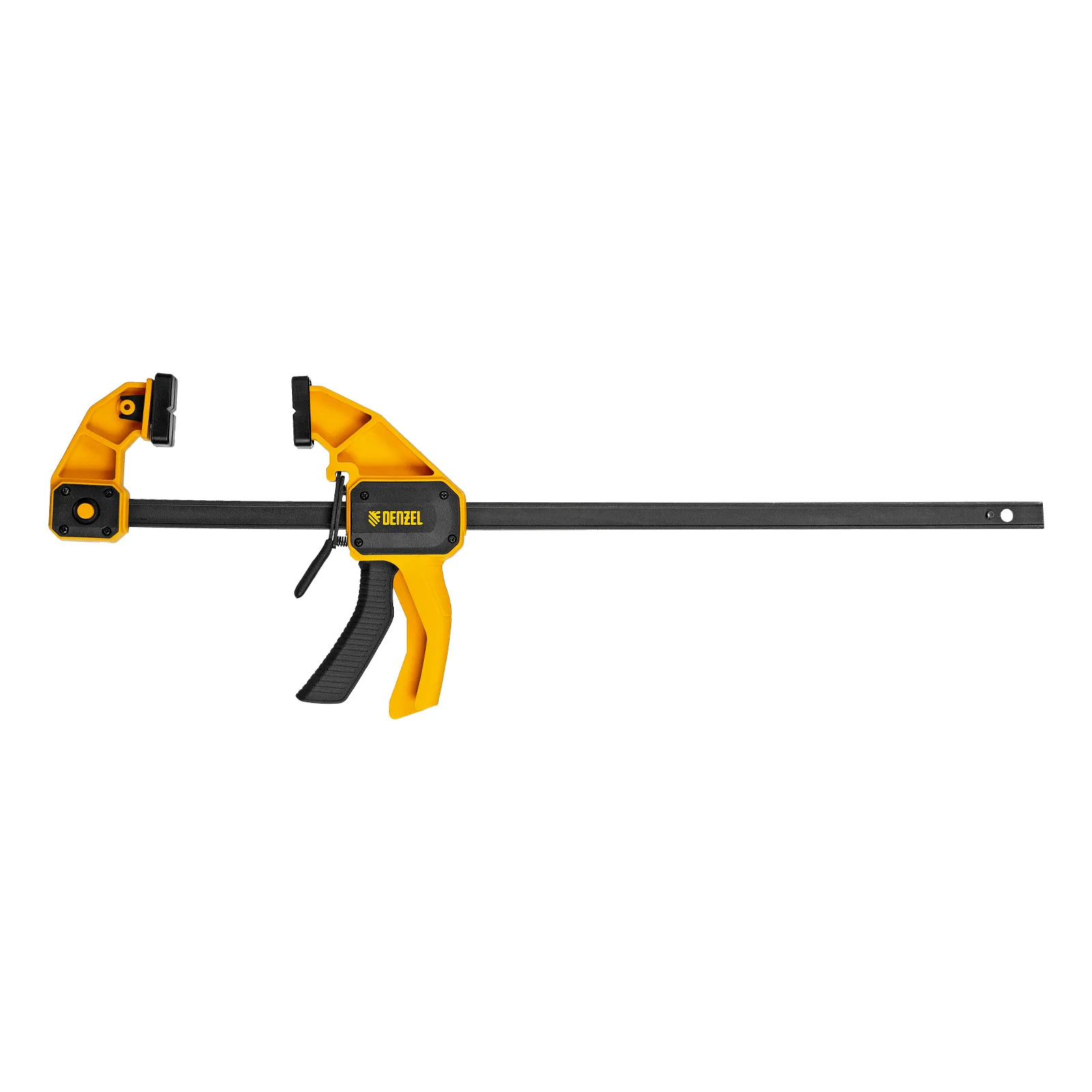 Струбцина F-образная быстрозажимная Denzel 20507 с пошаговым зажимом шириной 450 мм и глубиной 80 мм, с усиленным нейлоновым корпусом, позволяет прочно зафиксировать детали для их обработки, склеивания и выполнения других задач. Сила сжатия составляет 1300 Н. Струбцина подходит для бытового и профессионального применения.ПреимуществаУсиленная конструкция — нейлоновый корпус устойчив к ударным нагрузкам и падениям с небольшой высоты.Увеличенная жесткость и прочность — направляющая выполнена из двутаврового стального профиля и закалена.Универсальное применение — плавающая губка обеспечивает уверенное сцепление с любой поверхностью.Аккуратная работа с любыми материалами — съемные мягкие губки позволяют зафиксировать деталь без риска повреждения и деформации.Расширенный функционал — переставные губки позволяют использовать струбцину на разжим.Комфортное использование — струбцина весит всего 710 г, обрезиненная кнопка фиксации обеспечивает удобный захват.