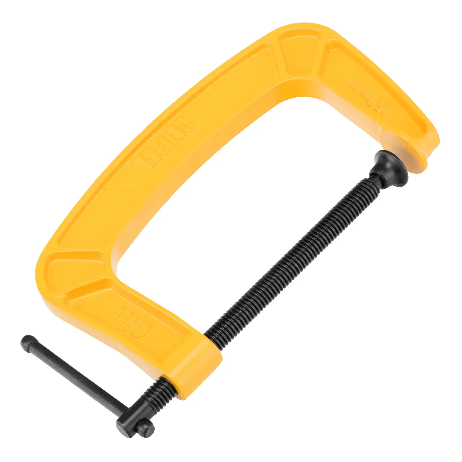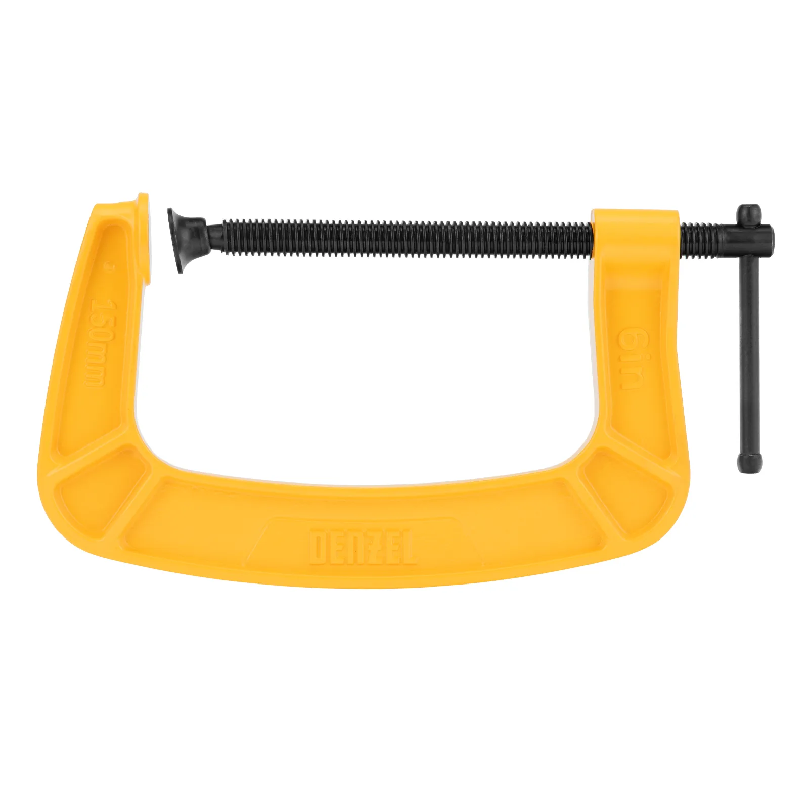 G-образная струбцина Denzel 20645 с максимальной шириной зажима 150 мм используется для фиксации заготовок или закрепления их на верстаке, станке или между собой. Позволяет склеивать детали, а также сверлить их, шлифовать, опиливать и проводить другие работы. Может использоваться во время выполнения сварочных работ. Винт с трапециевидной резьбой обеспечивает надежную фиксацию предметов. Струбцина применяется в слесарном и столярном деле, будет полезна также домашнем хозяйстве.