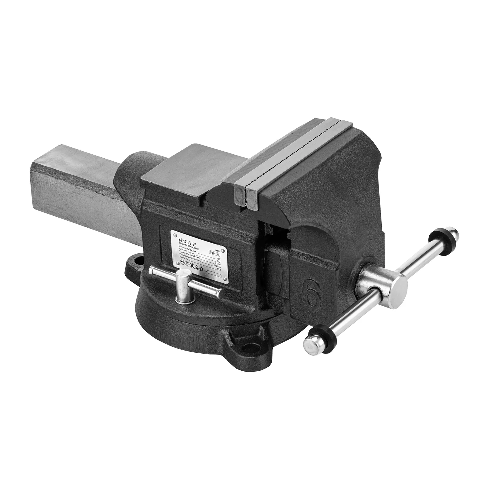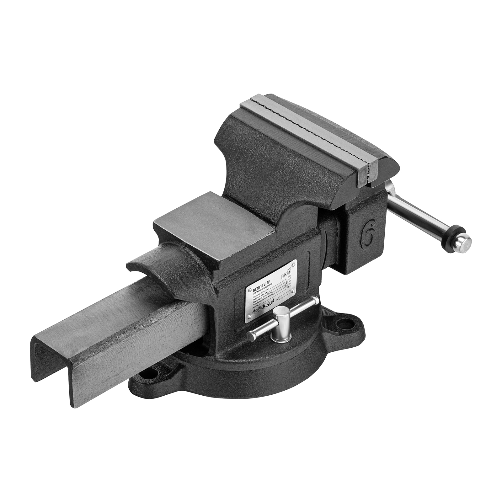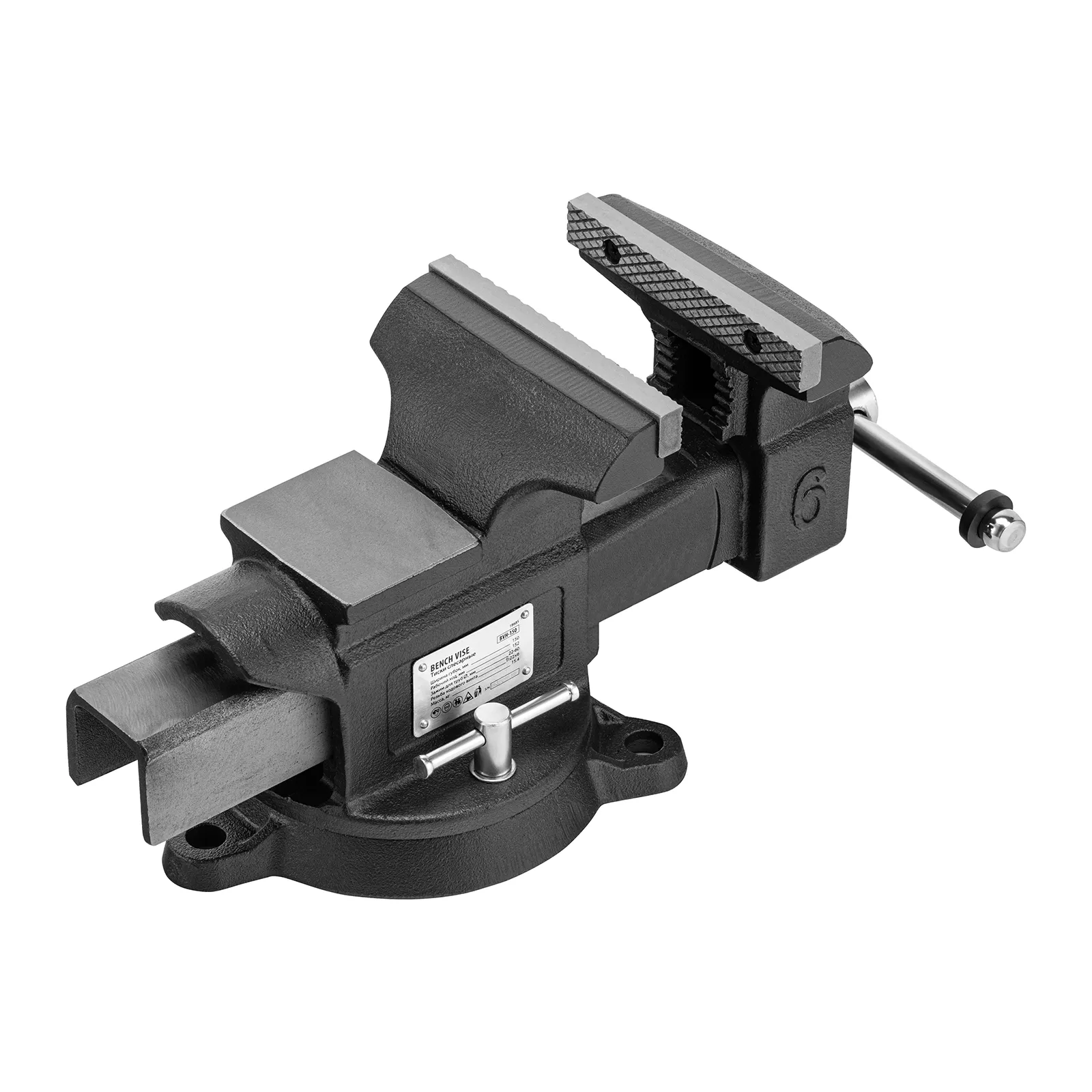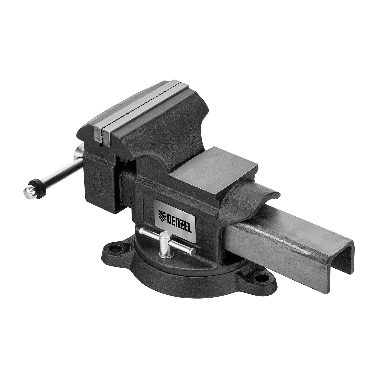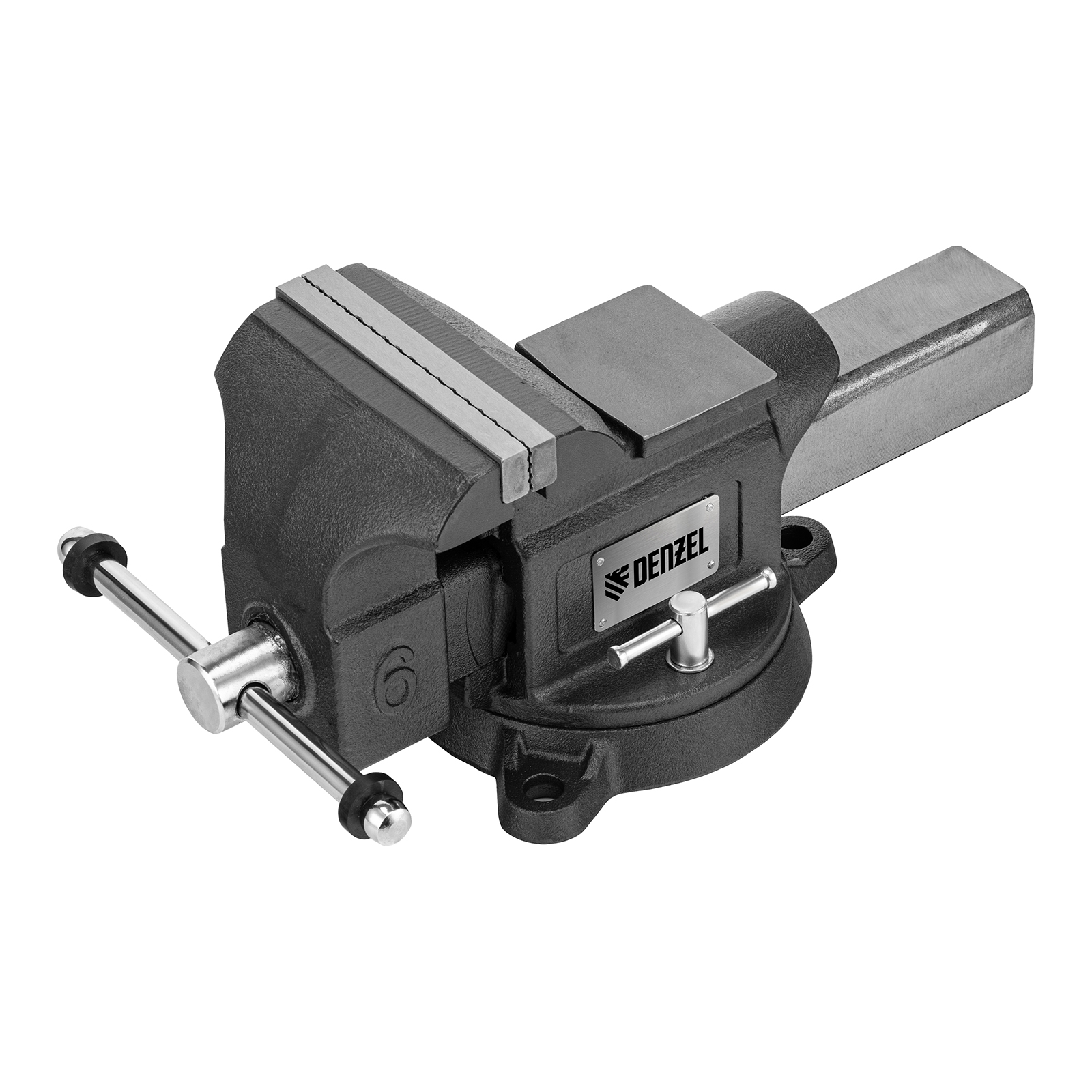 Слесарные поворотные тиски Denzel BVH-150 18685 с губками шириной 150 мм и стальной направляющей предназначены для фиксации деталей и заготовок, а также для выполнения мелких ударных работ — в конструкции предусмотрена наковальня. Рабочий ход составляет 150 мм, глубина зажима — 85 мм. Специальный зажим позволяет фиксировать трубы диаметром 22-60 мм, что расширяет возможности использования инструмента. На губки можно установить защитные накладки (приобретаются отдельно) для предотвращения повреждения зажимаемых предметов. Тиски пригодятся в мастерской и гараже.