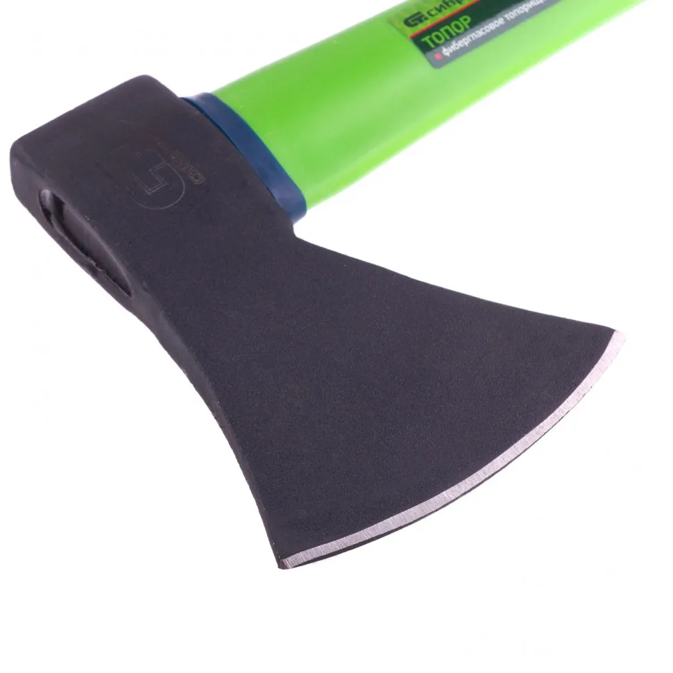 Топор Сибртех 21646 с рабочей частью весом 1000 г и фибергласовым топорищем позволяет осуществлять рубку, тесание и колку твердой или мягкой древесины. Он будет полезен на дачном и сельскохозяйственном участке при необходимости подготовки дров, рубки кустов, сучьев и других работ. Полотно оснащено полукруглой режущей кромкой с углом заточки 20-30 градусов, поэтому топором легко работать.ПреимуществаПолотно из стали 45 — топор оптимально подходит для непрофессионального применения.Прочность — полотно закалено до твердости 48-57 HRC (на высоте до 25 мм от режущей кромки).Заточенное лезвие — инструмент полностью готов к использованию после приобретения.Качественное топорище — фиберглас устойчив к негативным воздействиям окружающей среды, имеет механическую прочность и гасит вибрации.Надежный хват — небольшой изгиб и обрезиненные вставки снижают риск проскальзывания топора в руках.Быстрая работа — вес полотна 1000 г позволяет разрубать поленья за пару ударов.Эффективный замах — топор оснащен рукояткой длиной 415 мм.