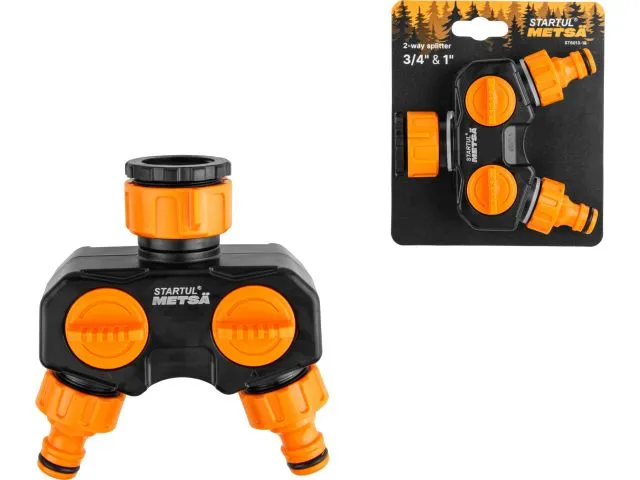Назначение: для подключения поливочных шлангов к водопроводной трубе или крану с внешней резьбой 3/4" или 1". Разделяет входящий поток воды на 2 выхода с возможностью перекрытия каждого потока. Поливочные шланги соединяются при помощи муфт быстросъемных;