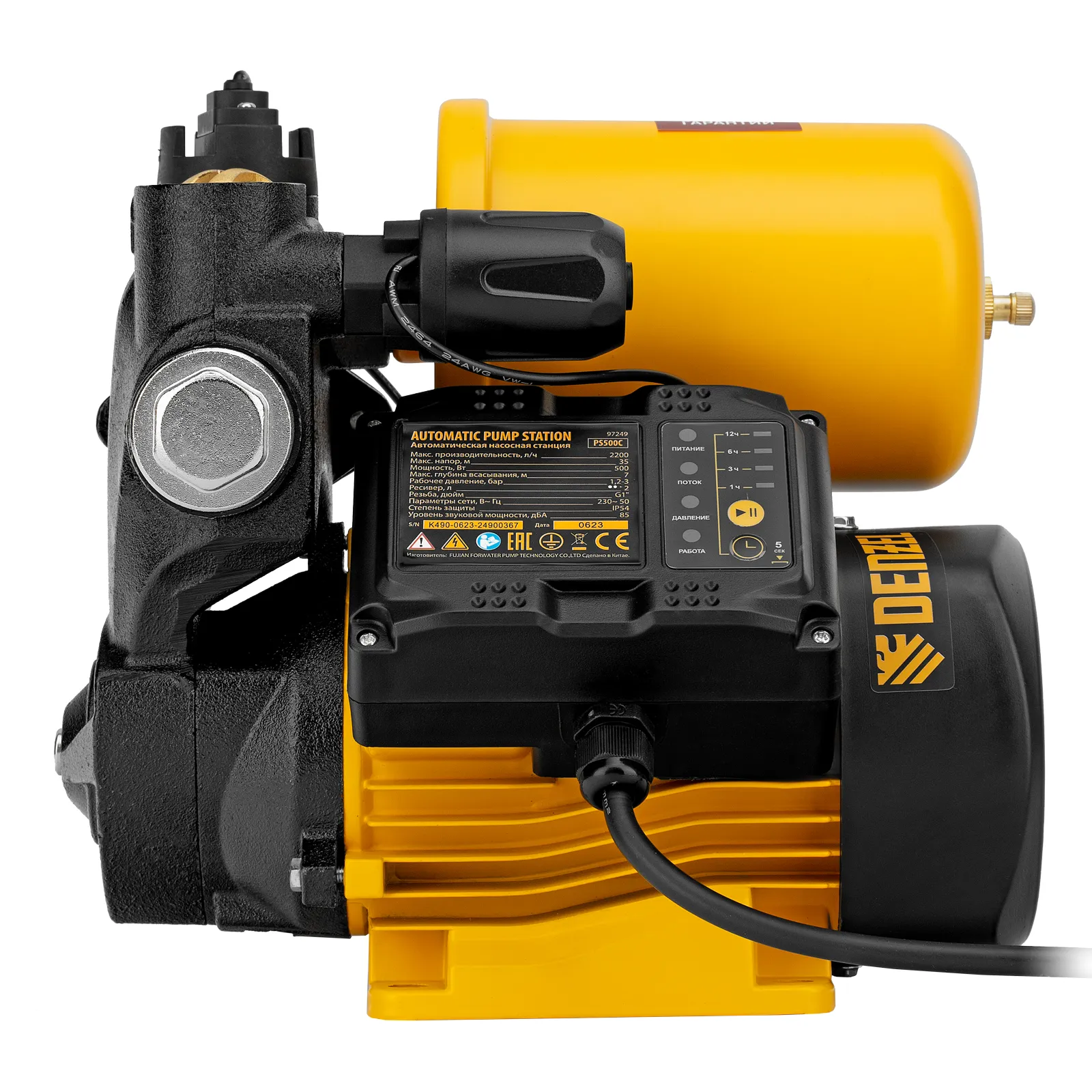 Насосная станция Denzel PS500C 97249 мощностью 500 Вт, с блоком управления и ресивером объемом 2 л, способна перекачивать 2200 л чистой воды в час и обеспечивает напор до 35 м. Возможен забор воды с глубины до 7 м из колодцев, скважин и других источников. Надежный асинхронный двигатель позволяет поддерживать стабильное давление в напорной магистрали в течение длительного времени. Станция позволяет организовать систему бытового водоснабжения на даче.