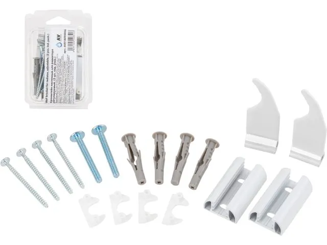 Набор настенных регулируемых кронштейнов для крепления радиатора к стене. Один набор предназначен для настенного крепления секционного радиатора длиной не более 10 секций. В противном случае для исключения поломки радиатора из-за провисания его центральной части рекомендуется крепить радиатор на трех кронштейнах, т.е. необходимо два набора регулируемых кронштейнов.