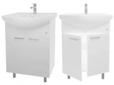 Тумба под умывальник АВН Эко+ это мебель эконом сегмента. Тумба под умывальник оснащена глубокими полочками, внутреннее пространство позволяет рационально размещать и хранить различную бытовую химию, а также средства личной гигиены. Боковые стенки выполнены из ЛДСП. Фасад выполнен из ЛДСП окрашенного в 5 слоев (три слоя грунта и два слоя матовой белой эмали (производство Италия)). Покраска материалов придает изделию дополнительную защиту от влаги и грибка. На мебели установлена фурнитура фирмы BOYARD, петли с доводчиками.