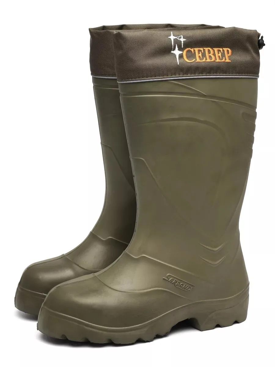 Сапоги оливкового цвета из ЭВА «Север» с надставкой на шнуровке изготовлены методом литья под давлением. Имеют 2-сл чулок из фольгированного полотна и натурального меха. Обладают высокими теплоизолирующими свойствами, сохраняют тепло до -40с, абсолютно водонепроницаемы, а также защищают от сырой нефти, от нефтяных масел и продуктов тяжелых фракций, от растительных и животных масел и жиров, от кислот концентрации до 80%, от растворов щелочей концентрации до 50%. Малый вес сапог экономит силы при ходьбе. Подошва с ярко выраженным протектором очень устойчива и превосходно защищает от скольжения. Упаковывается в индивидуальный короб.
