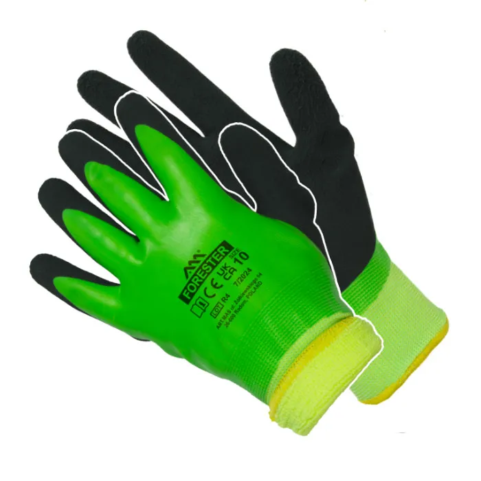 Утеплённые пятипалые защитные перчатки из флуоресцентно-жёлтого трикотажного полотна, покрытые гладким зелёным латексом, с дополнительным вспененным шероховатым чёрным латексным покрытием на кончиках пальцев и в области захвата. С эластичной манжетой.