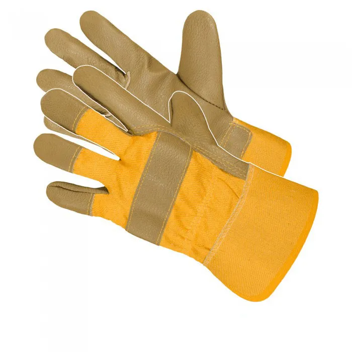 Защитные перчатки из натуральной кожи, желтого денима, прорезиненных манжет и подкладки на ладонях. Темная кожа.