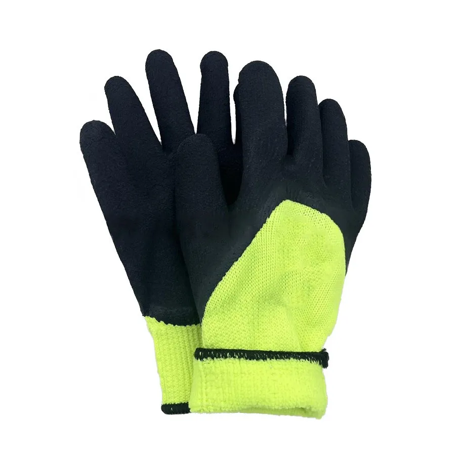 Перчатки с жёлтой махровой подкладкой из полиэстера, с черным латексным покрытием на 3/4.