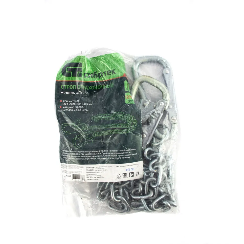 Цепной страховочный строп Сибртех 89508, модель «Г» с 2-мя карабинами, используется совместно со страховочно-удерживающими привязками при работе на высоте. Обеспечивает безопасность пользователя и оптимален для строительных, кровельных, монтажных и спасательных работ, в том числе связанных с огнем.ПреимуществаНадежная фиксация — изделие имеет 2 карабина из высококачественной стали.Прочность — строп из стали 1ПС способен выдерживать статические нагрузки не менее 15 кН (1500 кгс).Залог качества — гарантия на изделие составляет 2 года с момента покупки.Безопасность — изделие полностью отвечает требованиям ТР ТС 019/2011.