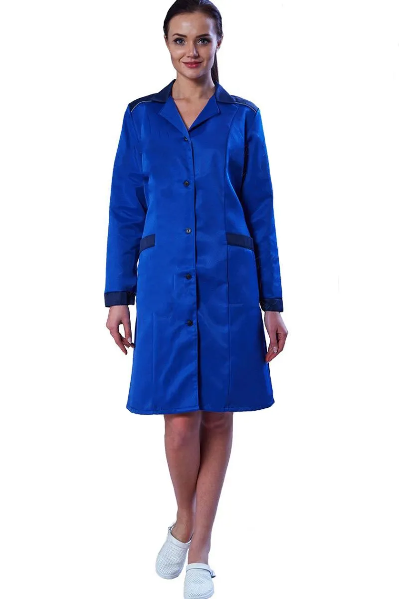 Халат с центральной бортовой застежкой на петли и пуговицы, со смещенным плечевым швом, воротник отложной. Полочки с вертикальными рельефами, с двумя нижними накладными карманами с наклонным входом. Боковые срезы карманов входят в боковые и рельефные швы.
