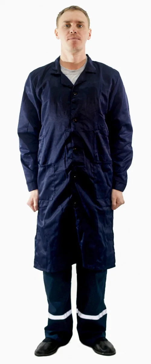 Халат рабочий свободного покроя, с застежкой на пуговицах. Рукава втачные длинные. Воротник в халате - отложной. Халат рабочий темно-синий - длинный, удобный в работе.