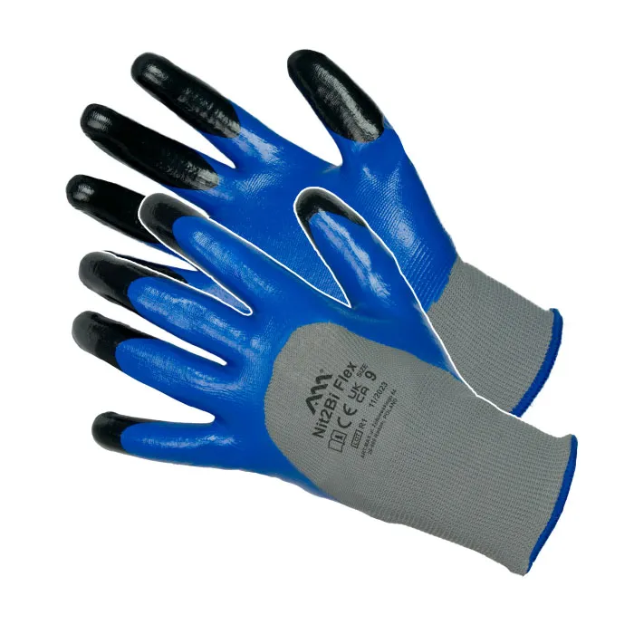 Надежные защитные перчатки из серого полиэстерового трикотажа, покрытые синим нитрилом на ¾ поверхности перчатки , дополнительно кончики пальцев покрыты черным нитрилом, бесшовные, с манжетой.