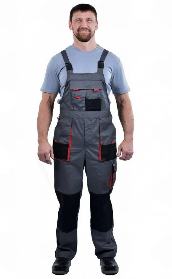 Застежки по бокам на пуговицы. Многочисленные объемные карманы. Усилительные накладки в области коленей.
