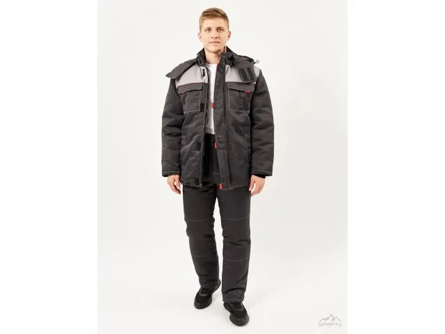 Куртка с центральной застежкой на молнию и утепленным ветрозащитным клапаном на липучках. Нагрудные накладные карманы с утепленными клапанами на липучке. Напротив каждой липучки вставлен красный флажок. Кокетки полочек и спинки выделены красным кантом. В рукавах - трикотажные напульсники. Внутренняя кулиса по линии талии для регулировки ширины куртки со шнуром-резинкой и фиксаторами. Накладной карман на липучке со стороны подкладки левой полочки. Отстегивающийся капюшон на молнии с лицевой кулисой со шнуром-резинкой и фиксаторами и хлястиком на полукольцах для регулировки высоты капюшона.