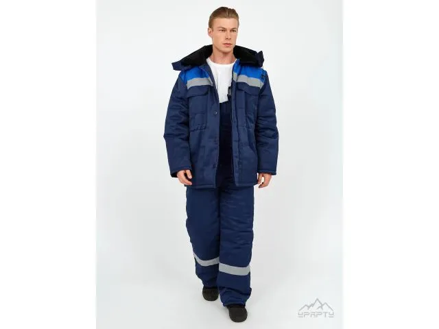 Классическая модель утепленного костюма с полукомбинезоном. Куртка с супатной застежкой на пуговицах, СОП по линии васильковой кокетки. Воротник из искусственного меха. Съемный регулируемый капюшон. На куртке два нижних накладных кармана с косым входом и два нагрудных кармана с клапанами. Регулировка объема по линии талии. Рукава с внутренними трикотажными манжетами.