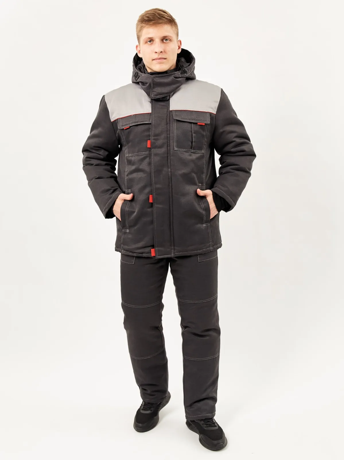 Куртка с центральной застежкой на молнию и утепленным ветрозащитным клапаном на липучках. Нагрудные накладные карманы с утепленными клапанами на липучке. Напротив каждой липучки вставлен красный флажок. Кокетки полочек и спинки выделены красным кантом. В рукавах - трикотажные напульсники. Внутренняя кулиса по линии талии для регулировки ширины куртки со шнуром-резинкой и фиксаторами. Накладной карман на липучке со стороны подкладки левой полочки. Отстегивающийся капюшон на молнии с лицевой кулисой со шнуром-резинкой и фиксаторами и хлястиком на полукольцах для регулировки высоты капюшона.