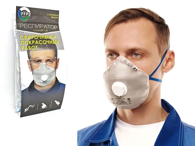 АЛИНА-211 - фильтрующая полумаска второго класса (FFP2 NR D/A) с клапаном выдоха. Защищает от всех видов аэрозолей, в том числе сварочных, при их концентрации до 12 ПДК, от органических газов (бензин, керосин, лаки, краски), паров от нагрева металлов и озона.