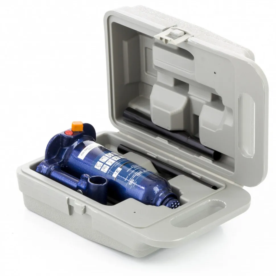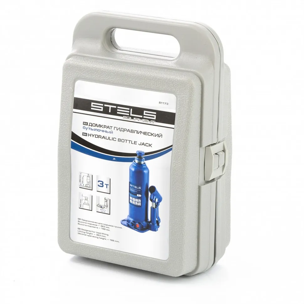 Гидравлический бутылочный домкрат Stels 51173, в пластиковом кейсе, предназначен для поднятия грузов весом до 3 т на высоту 188-363 мм. Он легко поместится в багажник, поэтому его можно брать с собой в дорогу или хранить в гараже для проведения самостоятельного ремонта авто. Также он подходит для профессионального применения на станциях технического обслуживания.ПреимуществаЗащита от перегрузки и поломки - встроенный клапан безопасности не допустит подъема груза, который весит более установленной нормы.Коррозионностойкая сталь - корпус отличается высокой прочностью и надежностью.Станина приварена к корпусу - на домкрате нет резьбовых соединений, поэтому конструкция не ослабнет со временем и домкрат прослужит долго.Удобство транспортировки и хранения - домкрат поставляется в пластиковом кейсе.