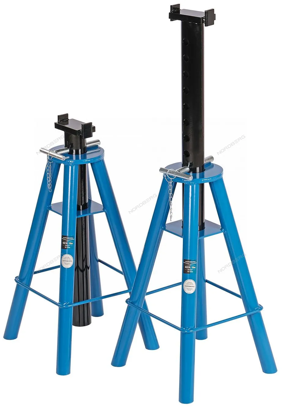Профессиональная высокая подставка NORDBERG для авто 10 т, 2 шт N3010L для фиксации и страховки при поднятии автомобиля, для выполнения ремонтных работ. Высота подхвата регулируется. Фиксация производится с помощью пальца, который вставляется в отверстие и не дает штанге двигаться. Страховку от случайного выпадения с помощью цепочки.