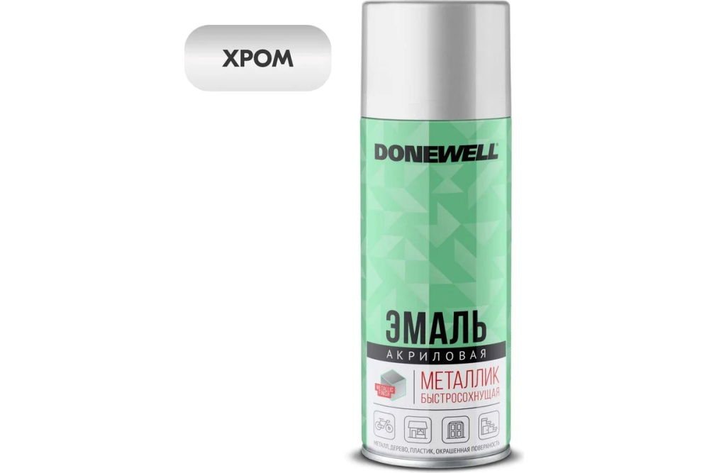Универсальная эмаль металлик DONEWELL хром DW-1027 - высококачественная быстросохнущая эмаль предназначена для декоративной окраски металлических, деревянных, пластиковых, гипсовых и керамических поверхностей. Имеет яркий и насыщенный металлический блеск. Легко наносится на труднодоступные поверхности. Применяется для внутренних и наружных работ.