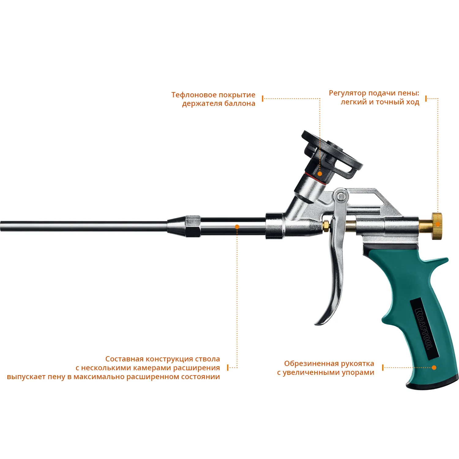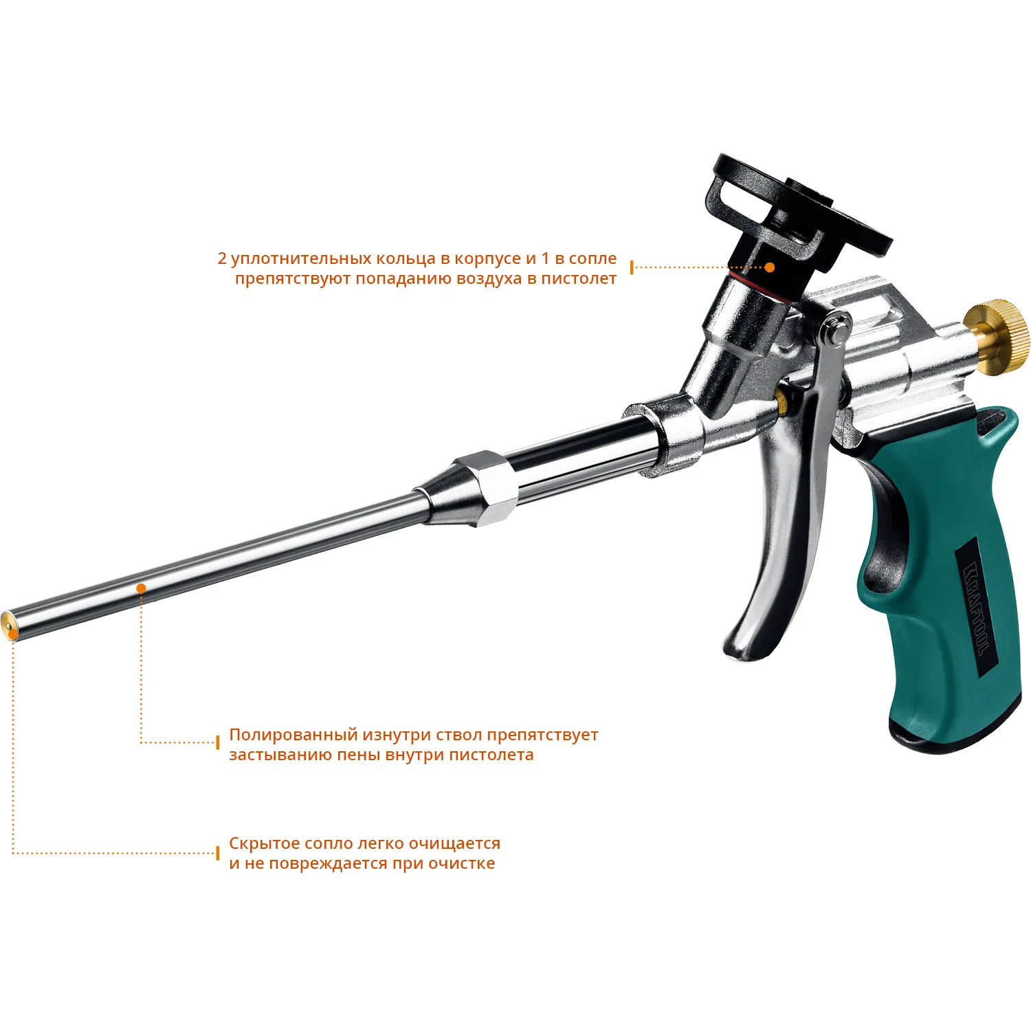Пистолет для монтажной пены PRO KRAFT применяется для профессионального нанесения монтажной пены. Высокая точность изготовления и инновационная конструкция обеспечивают герметичность и длительный срок службы. Инструмент имеет полное тефлоновое покрытие держателя и это обеспечивает быструю и простую очистку, что высоко ценится профессионалами.